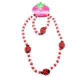 Prisrčen komplet dodatkov za male dame z motivom pikapolonic. Vsebuje ogrlico in zapestnico iz lesenih kroglic, nanizanih na elastični gumici, zato sta udobni in prilagodljivi. Odlično za vsakodnevno nošenje ali kot prisrčno darilo.