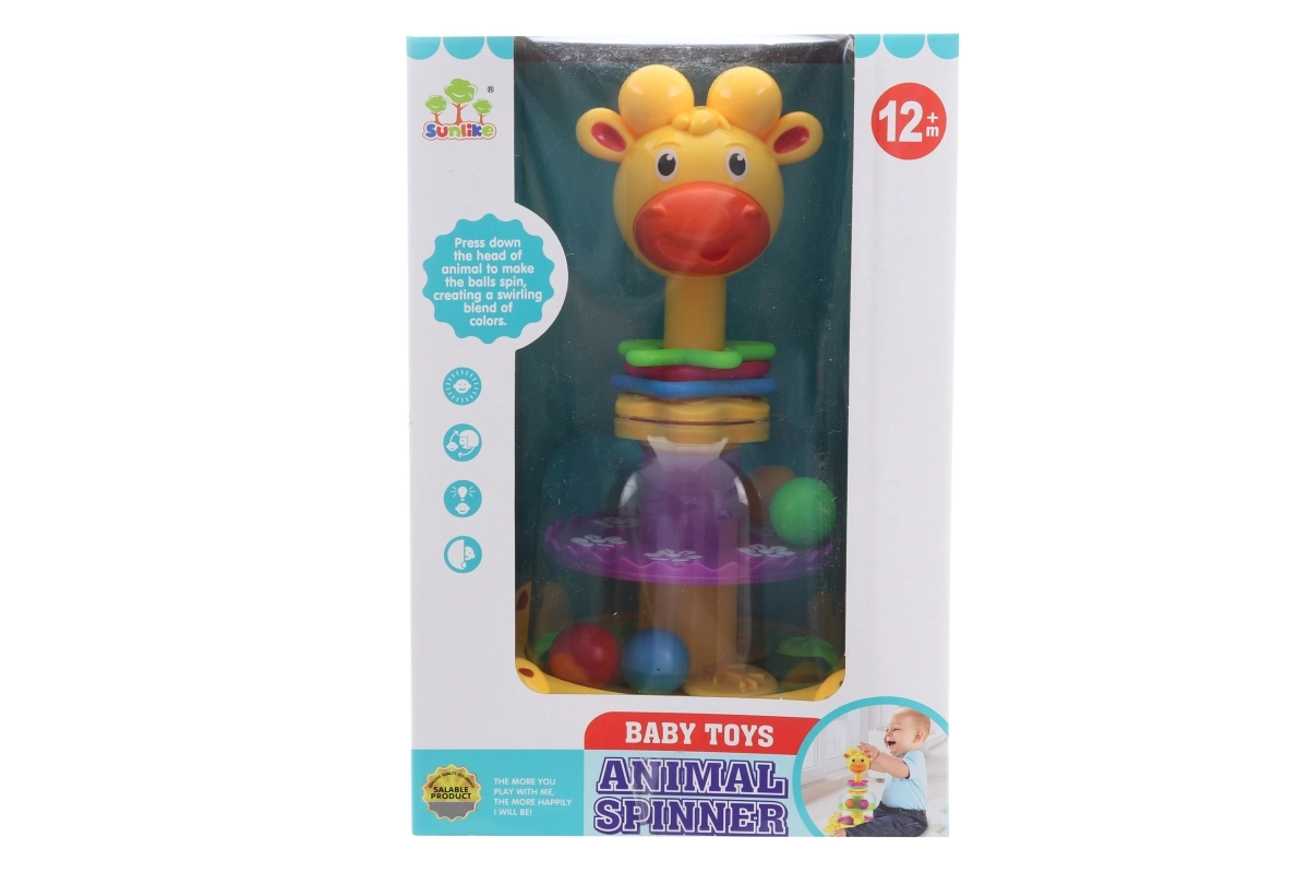 Ta vesela vrteča igrača v obliki žirafe prinaša otrokom veselje do gibanja in odkrivanja. Z enostavnim pritiskom na glavo žirafe se zavrtijo notranji deli s kroglicami, kar ustvari privlačen vizualni učinek in motivira otroke k ponovnemu igranju. Vrtiljak je idealen za razvoj fine motorike, koordinacije roka–oko in zaznavanja barv.