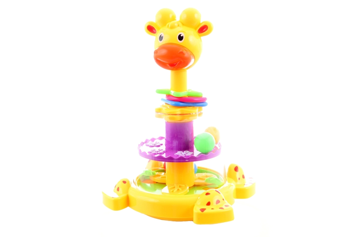 Intuitiven mehanizem: z nežnim pritiskom na glavo žirafe se zavrtijo barvite kroglice in obročki v prozorni komori.