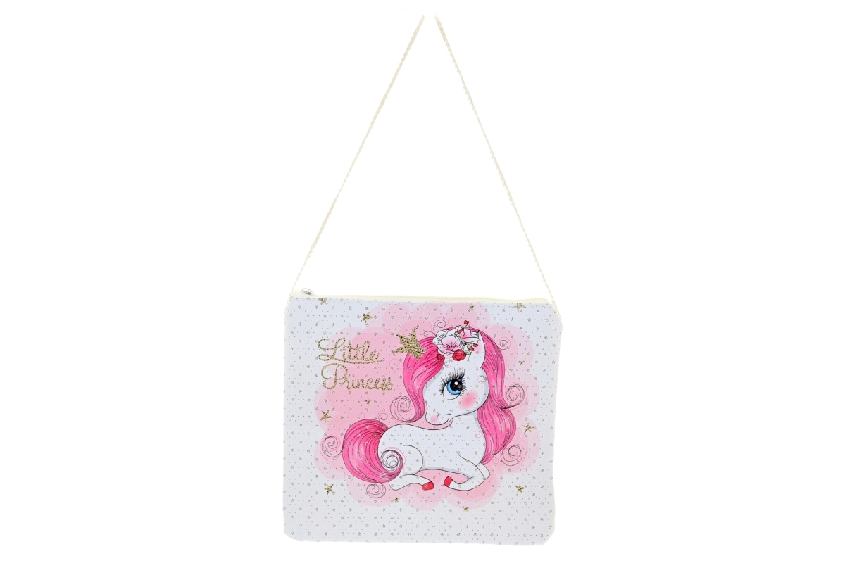 Ta dekorativna torbica z motivom samoroga izstopa z izrazitim sijočim potiskom na sprednji strani (umetno usnje) ter prijetno tekstilno izdelavo. Idealna je kot stajliš dodatek k outfitu, za drobnarije ali kot darilo za ljubitelje samorogov.