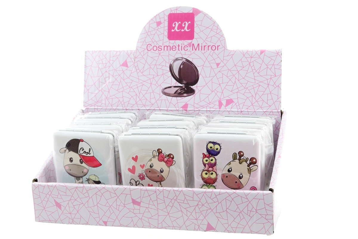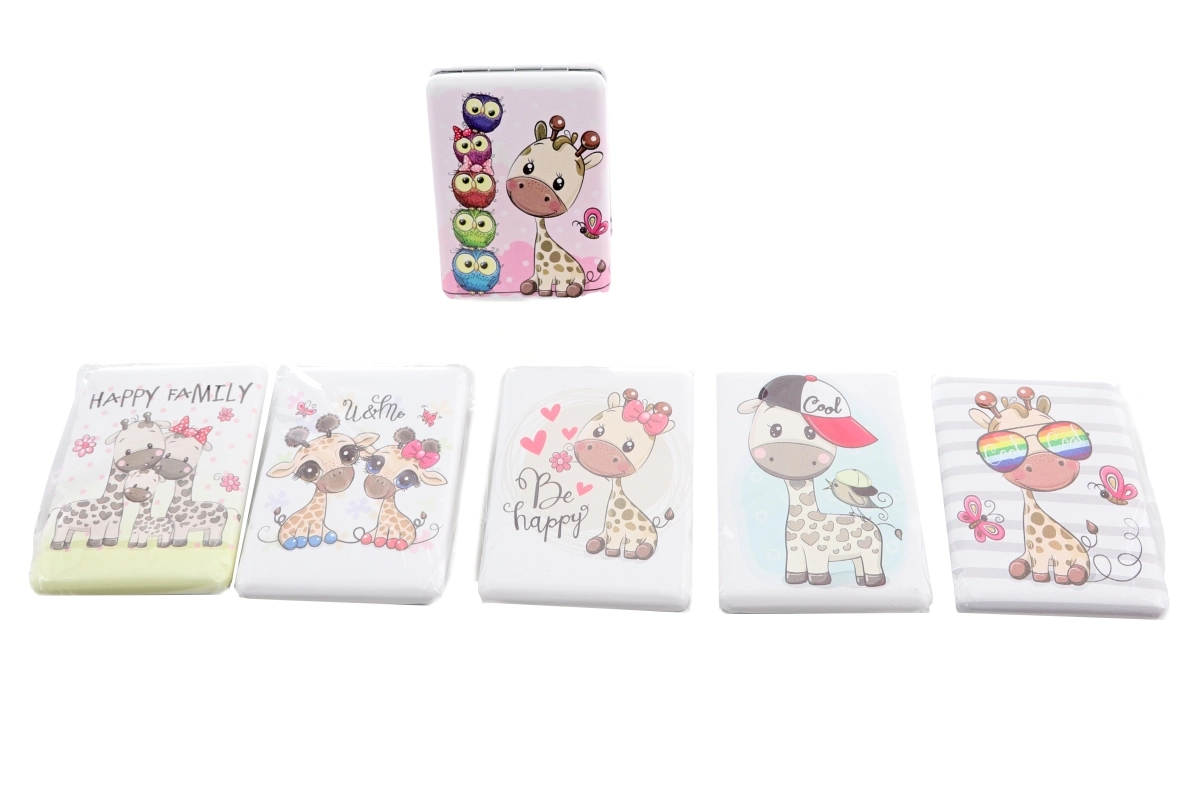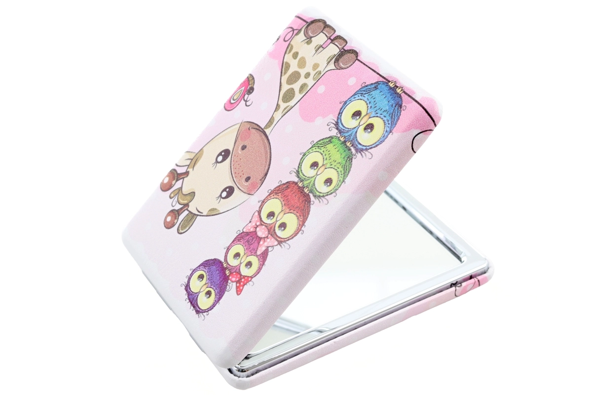 Stilsko žepno ogledalce z motivom veselih žiraf je idealno za torbico in na pot. Ponuja kompaktne mere 6 × 8,5 × 1,5 cm in ima po odprtju ogledalce na obeh straneh za udoben pregled videza. Na voljo je v več različnih dizajnih – pošiljamo glede na trenutno razpoložljivost na zalogi. Pakirano v vrečki. Izdelek ni igrača.