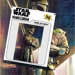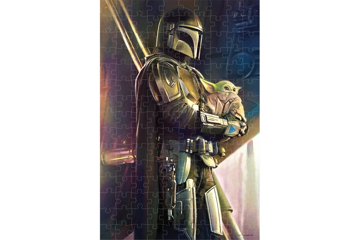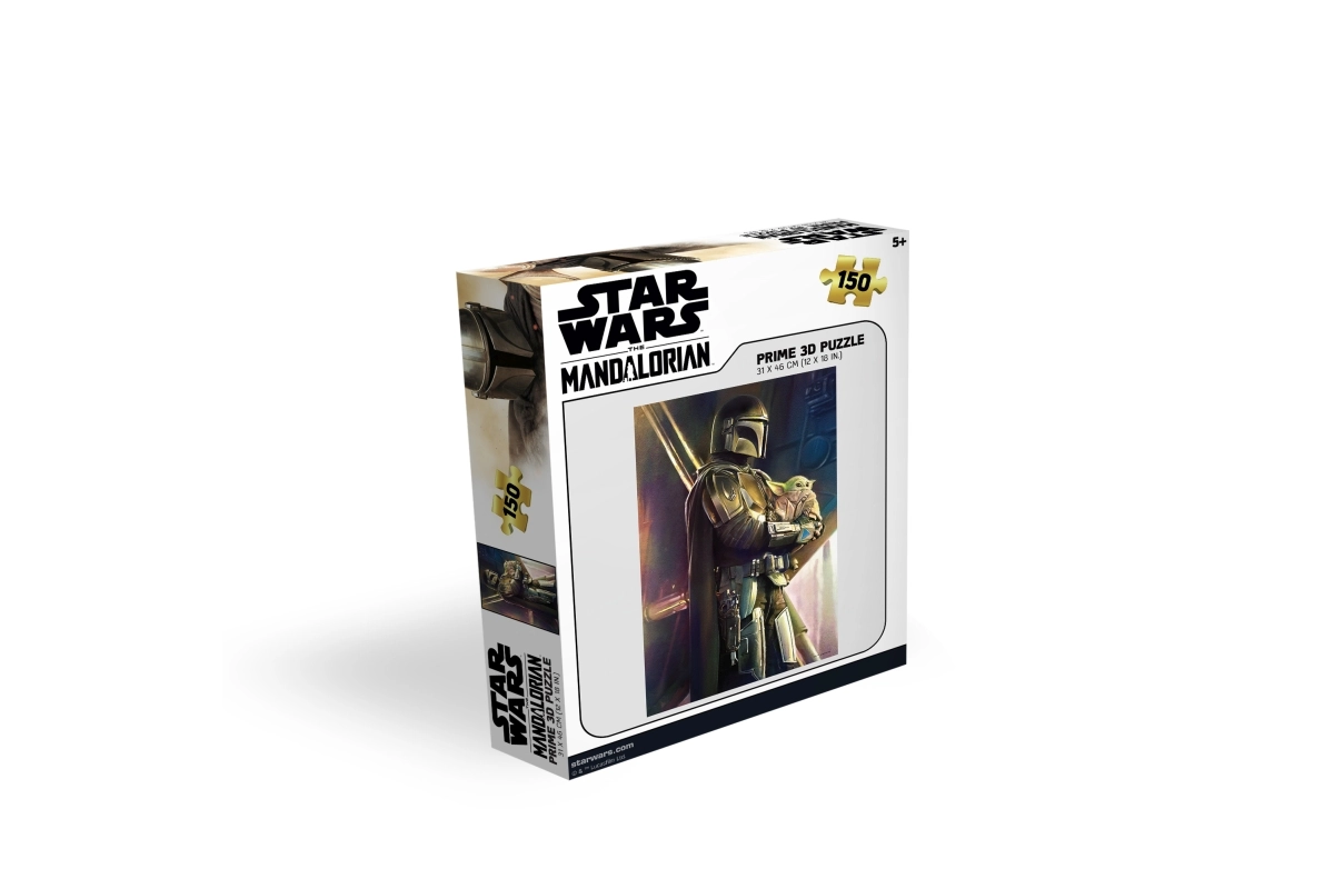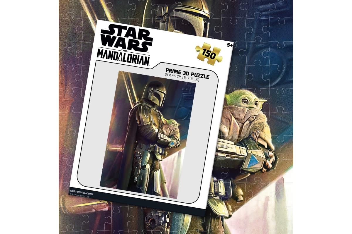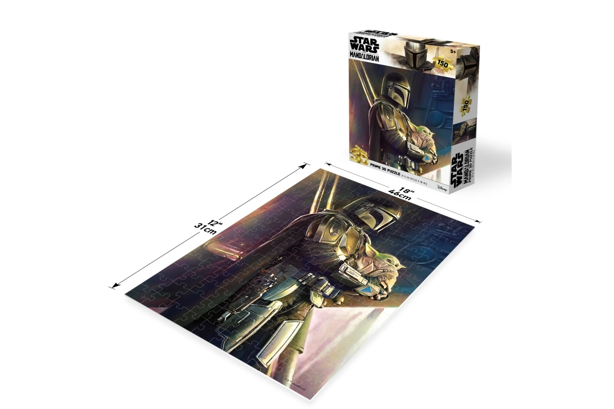 Posebna 3D (lentikularna) obdelava daje sestavljenemu motivu globino in dinamiko – Mandalorian z Grogujem izstopa iz vsakega kota.