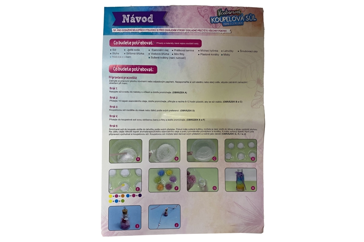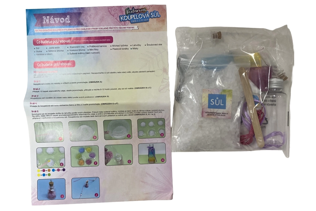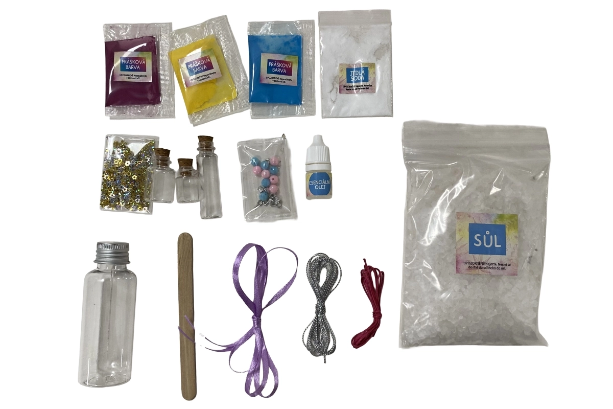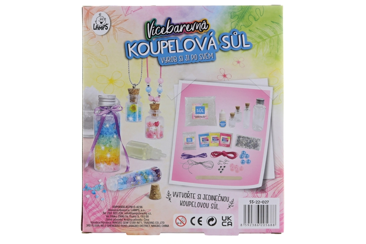 S tem zabavnim kompletom si zlahka ustvarite edinstveno kopalno sol po svoji domišljiji. Kombinirajte barve, vonje in okraske ter izdelajte izvirna darila ali sprostitvene mešanice za kopel. Enostavna navodila in vse pripomočke v paketu zagotavljajo, da se lahko ustvarjanja loti vsak.