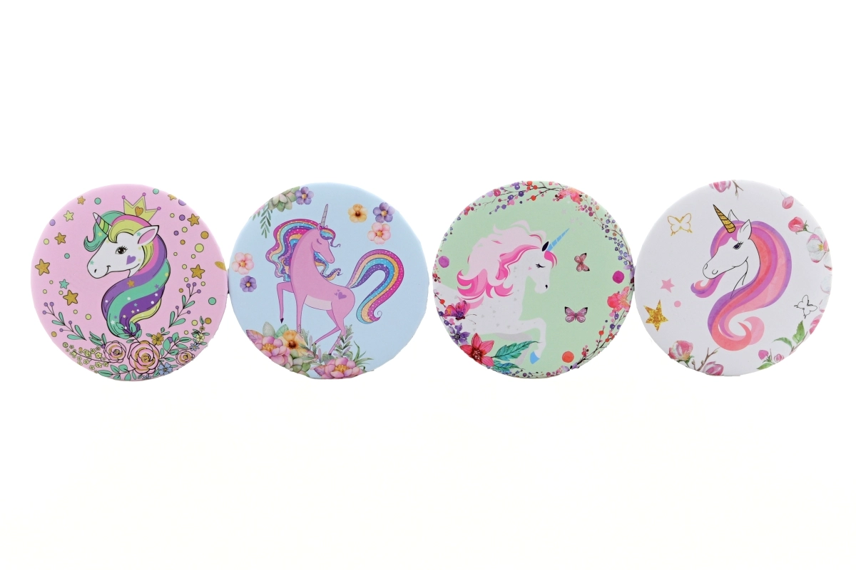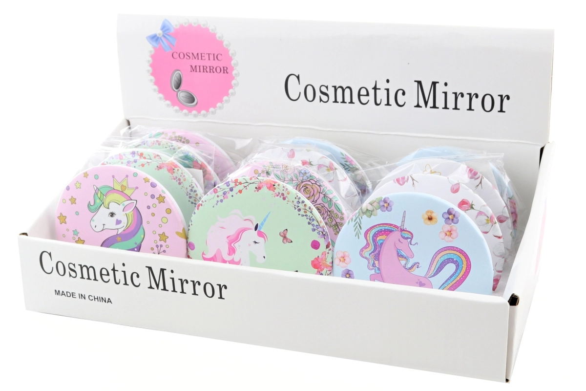 Stilsko okroglo ogledalce s pravljičnim motivom samoroga razveseli pri vsakodnevni uporabi in kot prijetno darilo. Kompaktna velikost približno 7 cm se prilega vsaki torbici. Lahkoten plastičen material, praktična embalaža in različni dizajni glede na zalogo. Izdelek ni igrača.