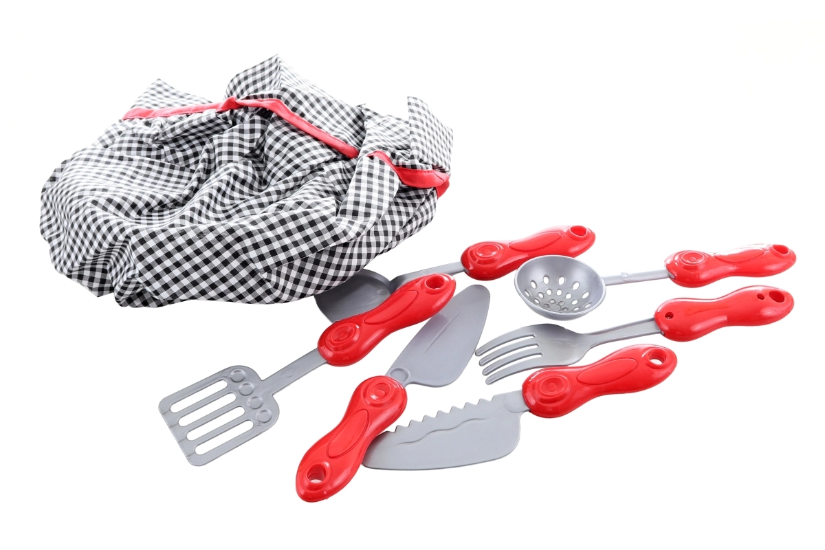 Popolna oprema vključuje suknjič, kapo, rokavico in set kuhinjskih pripomočkov – takoj pripravljeno za igro kuhanja.