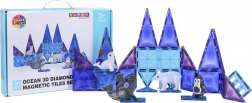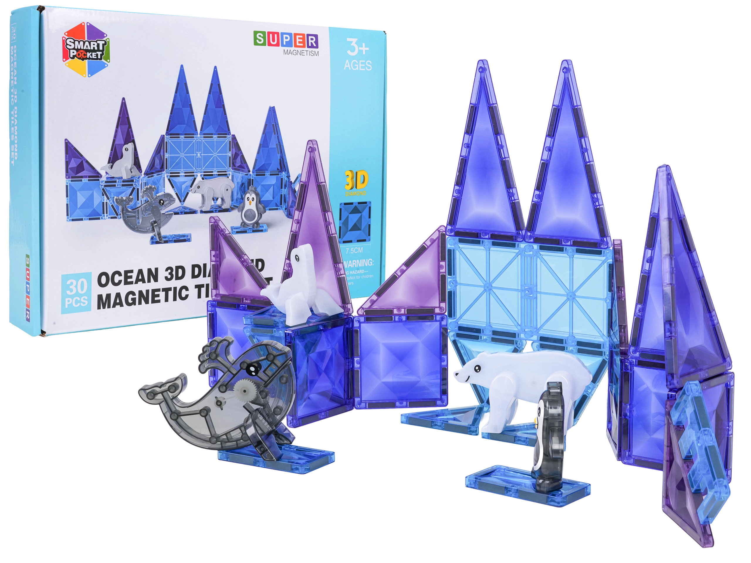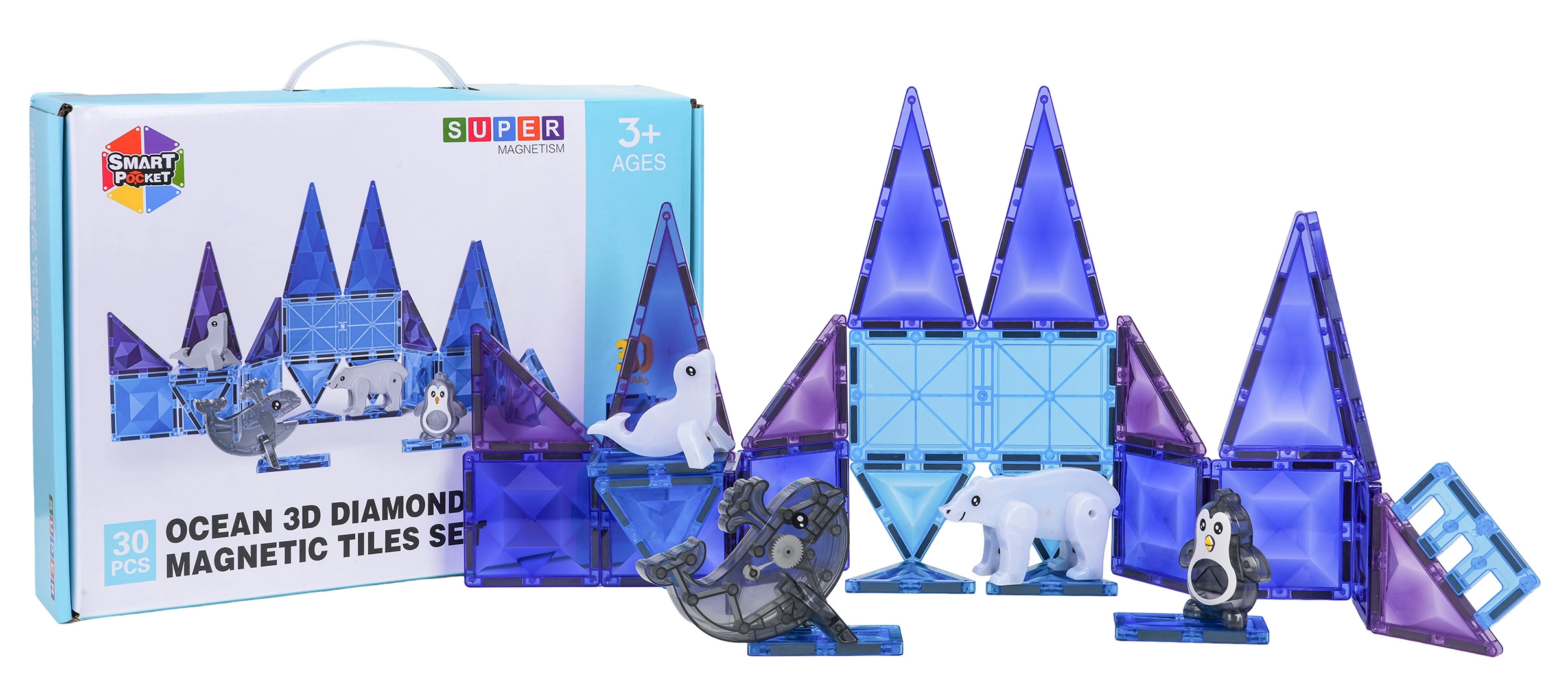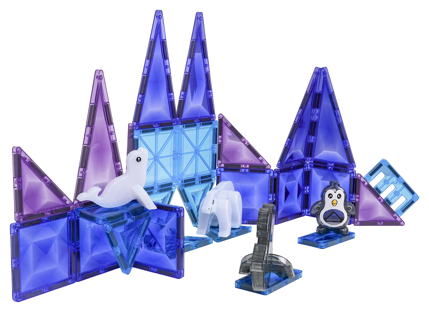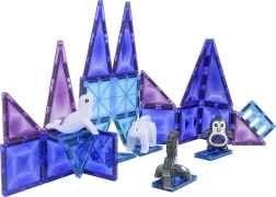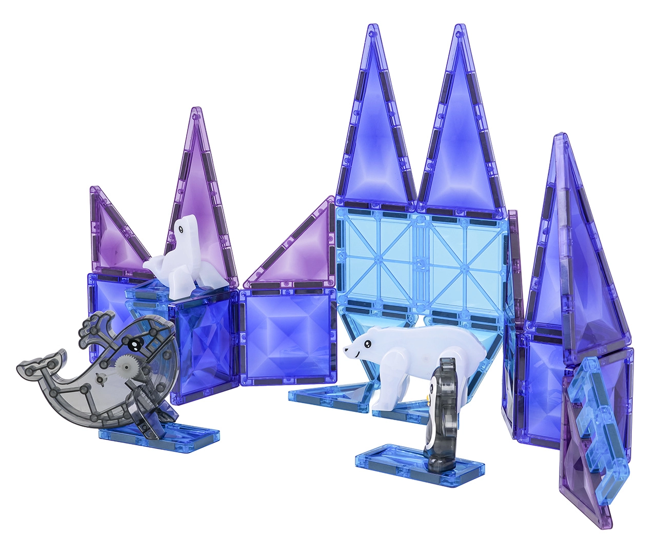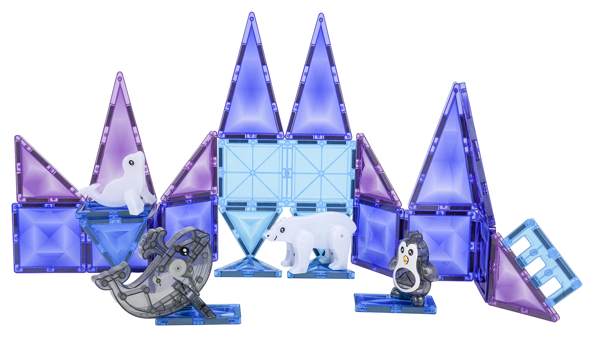Magnetni gradbeni set Ice Snow je zasnovan za otroke od 3. leta starosti. Polprosojni deli v hladnih barvah se zlagajo v stolpe, zidove in ledene palače, pri čemer magnetni spoji držijo obliko, zato so konstrukcije stabilne. Del seta so tudi prikupne figurice – tjulenj, pingvin, delfin in polarni medved – ki oživijo vsako igro.