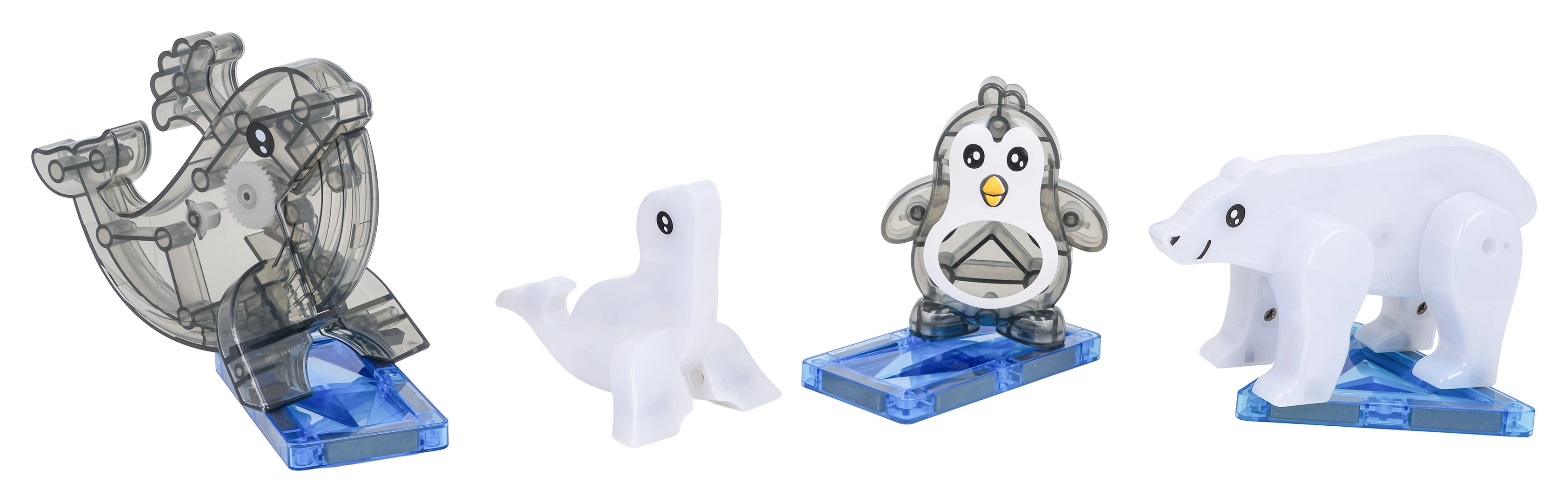 Figurice imajo premične elemente (delfin odpira gobec, medved premika noge, pingvin dviguje in spušča plavuti), kar podpira domišljijske zgodbe in fino motoriko. Deli se lahko kombinirajo pod različnimi koti in ustvarjajo neomejene variacije zgradb – od preprostih oblik do kompleksnih 3D modelov.