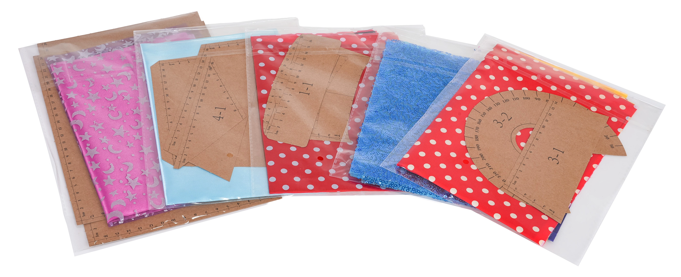 Set vsebuje vrečke s tkaninami in kartonskimi kroji, ki olajšajo natančno rezanje ter hiter prehod od ideje do šivanja.