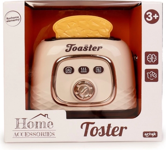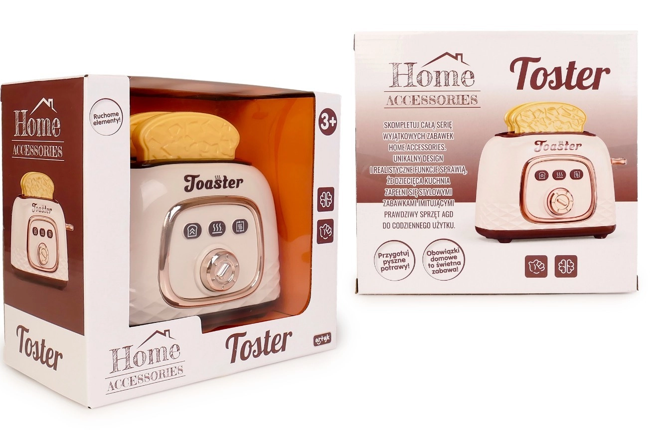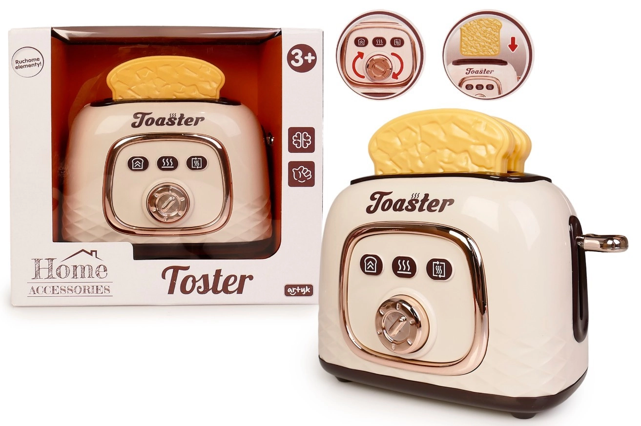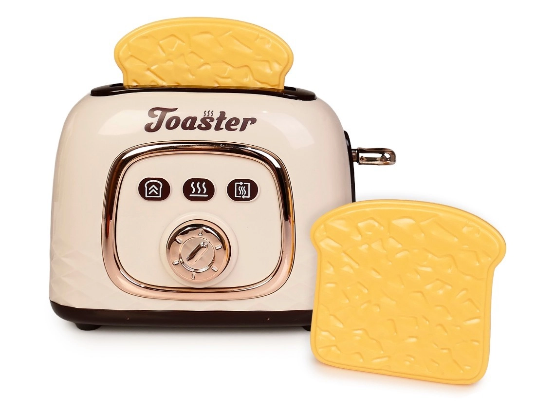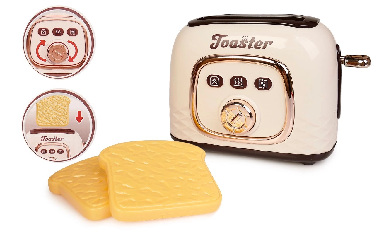 Otroški toaster s toastom je idealen dodatek v vsako otroško kuhinjico. Zaradi enostavnega upravljanja bodo otroci uživali v realistični pripravi zajtrka – pritisnejo stranski gumb, toasti se spustijo in po kratkem času sami skočijo ven.