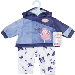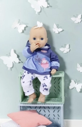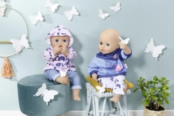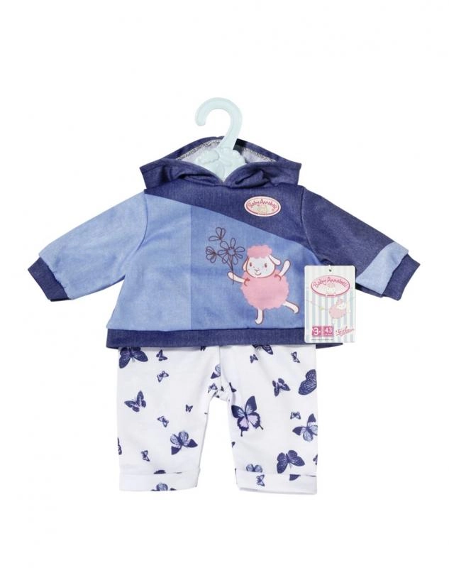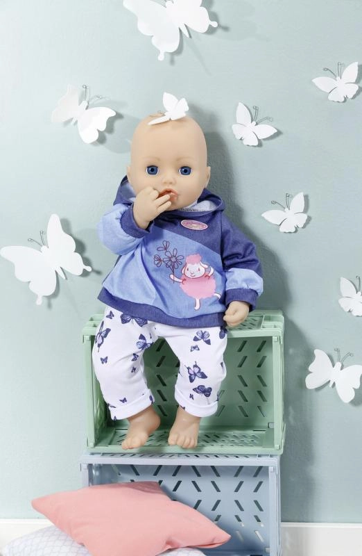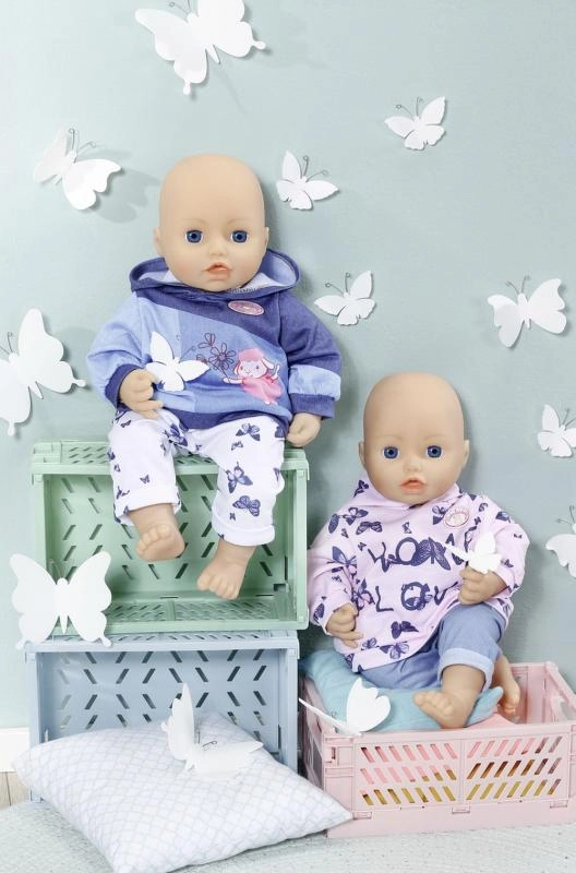 Privoščite svoji punčki BABY ANNABELL prijeten domači outfit. Set ponuja dva različna videza: rožnat pulover s kapuco z nežnimi metuljčki in hlače v džins stilu ali moder pulover s kapuco z ljubko sličico ter udobne športne hlače. Materiali so mehki in prijetni na dotik, idealni za vsakodnevno igro.