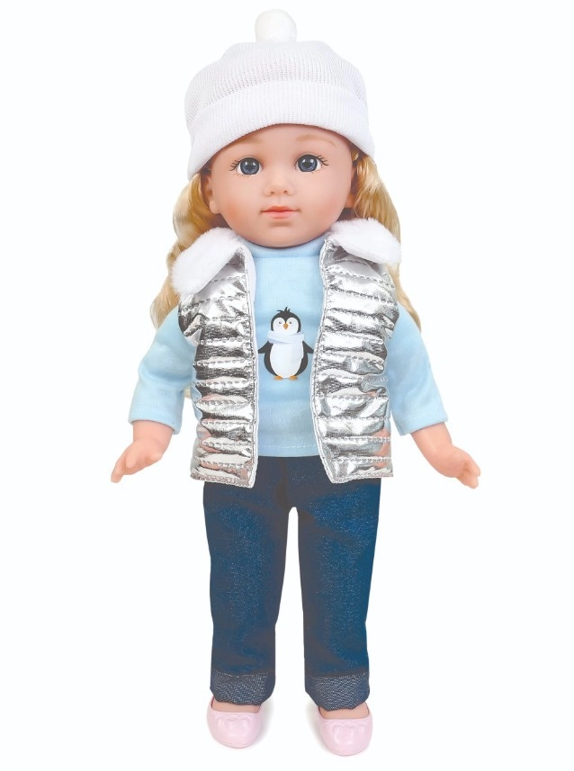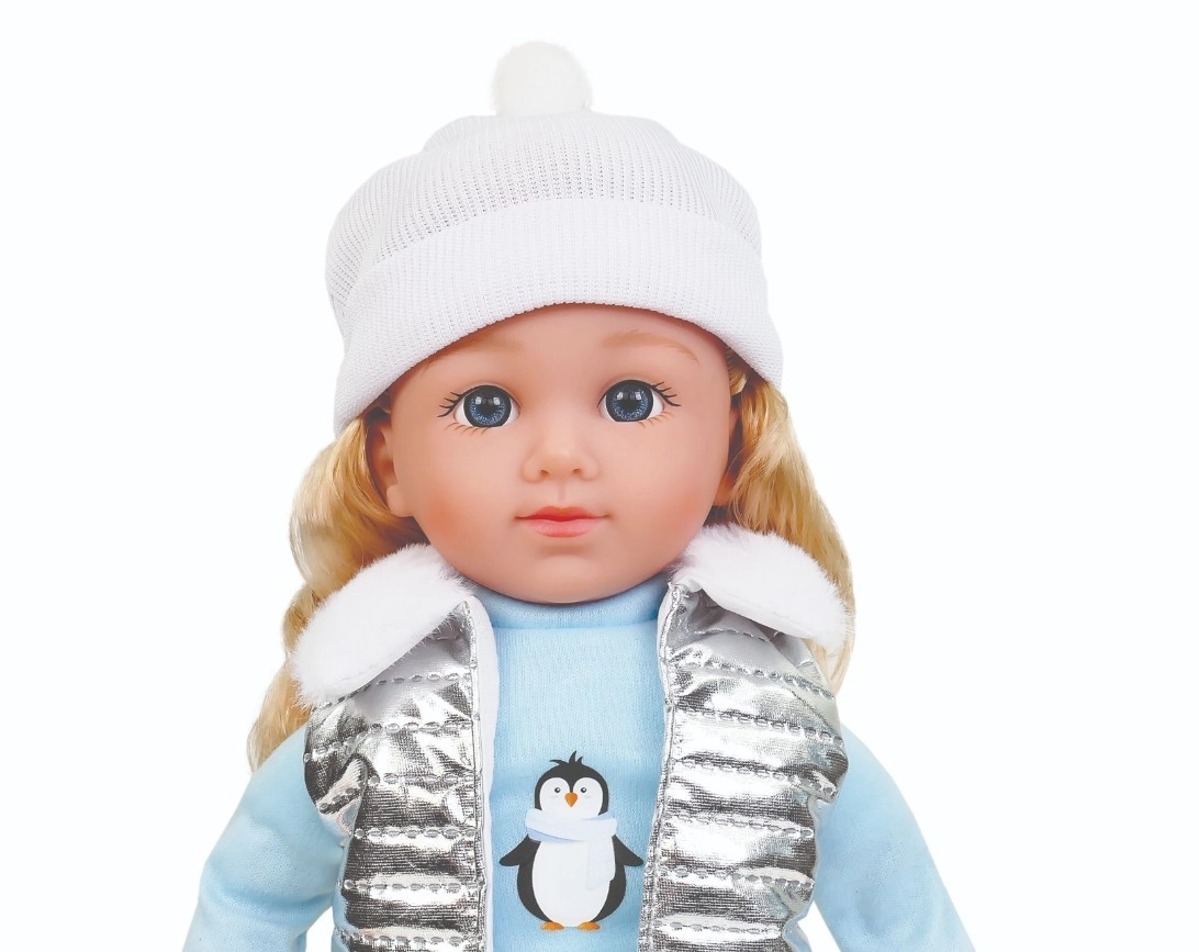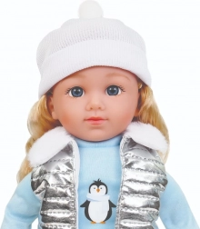 Punčka Natalia v mehki beli kapici, s srebrnim prešitim telovnikom s krznenim ovratnikom, svetlo modro majico z motivom pingvina, temnimi hlačami in rožnatimi čevlji je odlična prijateljica za vsakodnevno igro. Ob pritisku na trebušček izgovarja poljske fraze in poje 2 melodiji, s čimer spodbuja igro vlog in razvija otroško domišljijo.