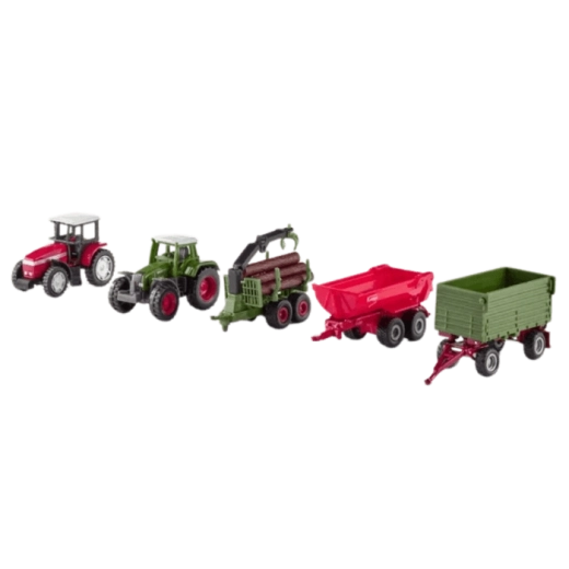 Ta vsestranski set Siku Farmer prinaša avtentično izkušnjo sveta kmetijske tehnike. Vsebuje traktor MASSEY FERGUSON 9240, traktor FENDT FAVORIT 926, gozdarsko prikolico z vrtljivim in nihajnim nakladalnim žerjavom, rdeči prekucnik KRAMPE in dvoosno prikolico. Natančna izdelava in funkcionalni detajli podpirajo kreativno igro in razvoj motorike.