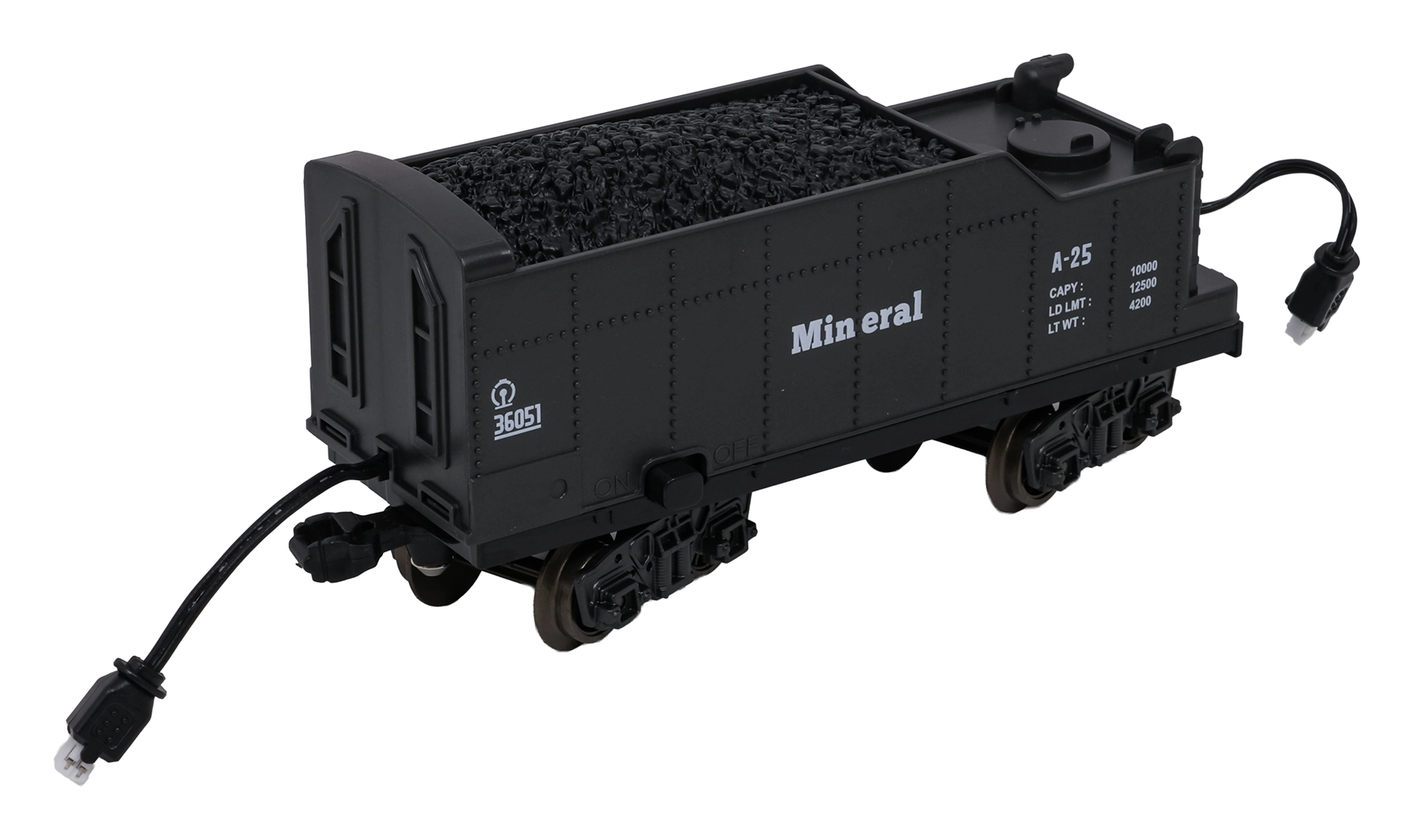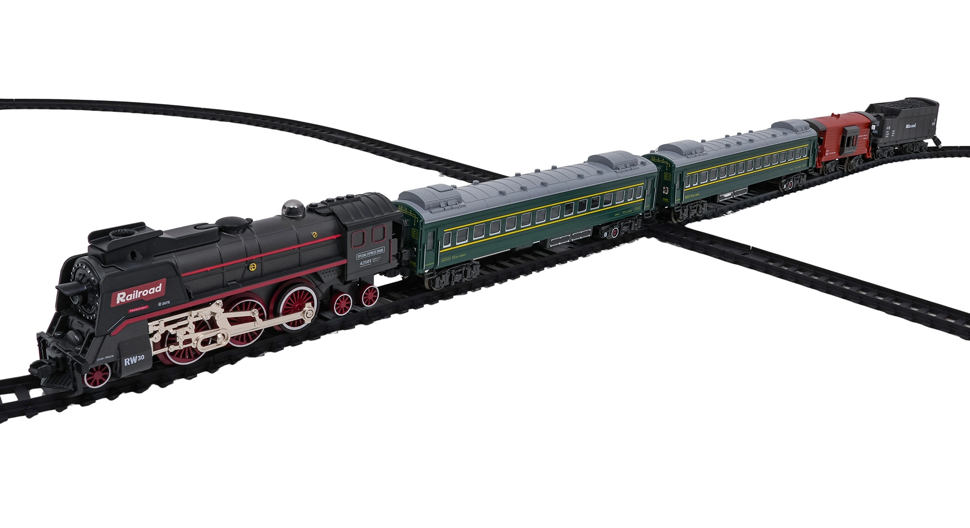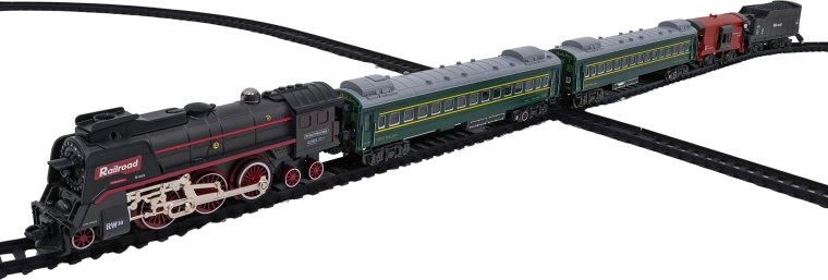 Komplet vsebuje lokomotivo, 2 potniška vagona, vagon z ogljem in tovorni/živinski vagon, ki skupaj tvorijo impresivno kompozicijo. Trpežne plastične tirnice se hitro sestavijo v velik krog približno 216 × 92,5 cm. Za mirnejšo igro lahko zvoke lokomotive izklopite.
