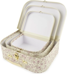Ta eleganten komplet kovčkov je odličen za organizacijo otroških stvari in kot prijeten dodatek notranji opremi. Lahka, a čvrsta kartonasta konstrukcija s kovinskimi okovji zagotavlja vzdržljivost in udobno prenašanje. Zaradi različnih velikosti si otroci zlahka izberejo pravega za izlet, vrtec ali k babici.
