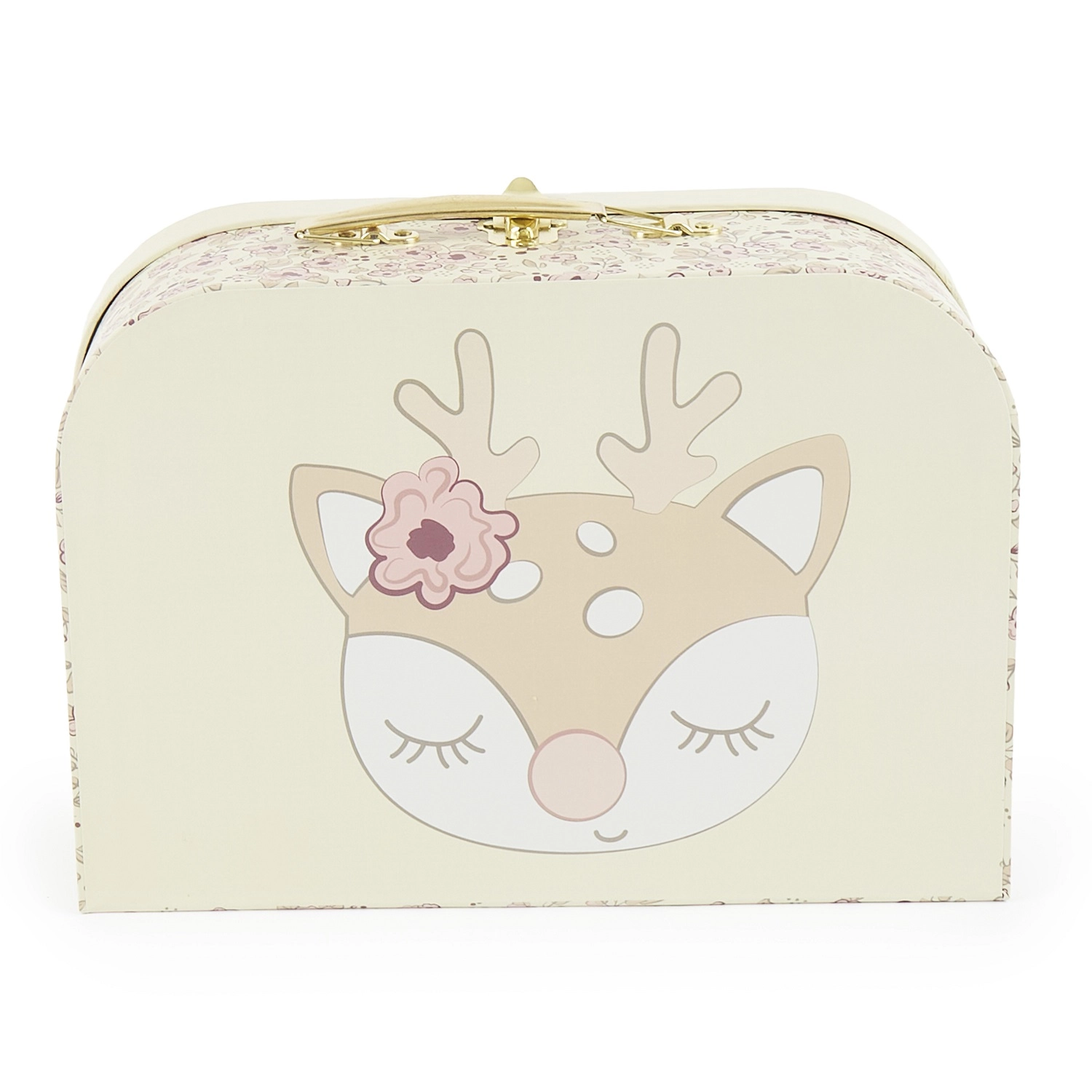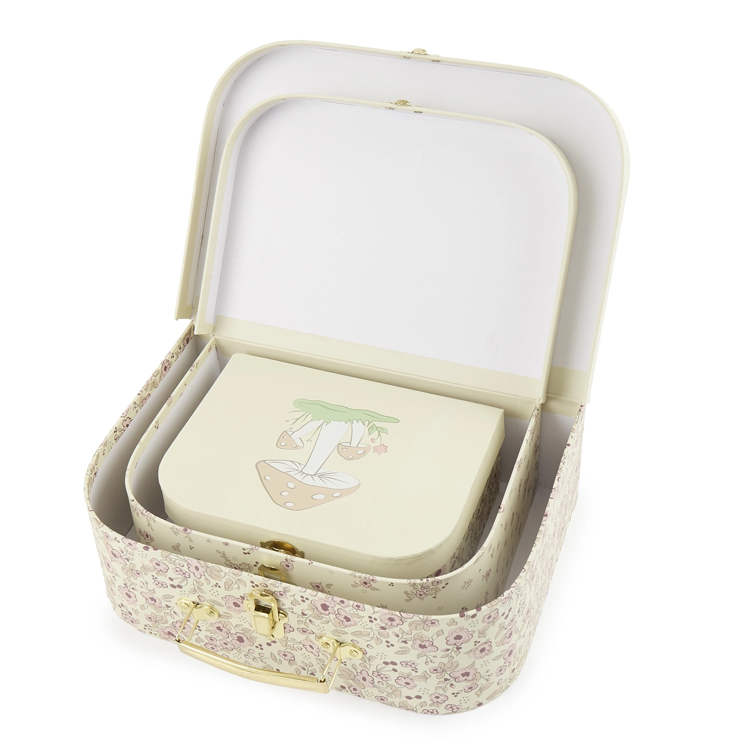 Slogovit komplet treh kartonastih kovčkov polepša otroško sobo in potovanja. Združuje prisrčen motiv košutice Ella, vintage cvetlični vzorec, trden kovinski zapenjalnik in udoben ročaj. Zahvaljujoč vložljivemu (nesting) dizajnu so kovčki prostorsko varčni, lahki in idealni za shranjevanje zakladov, igrač in drobnarij.