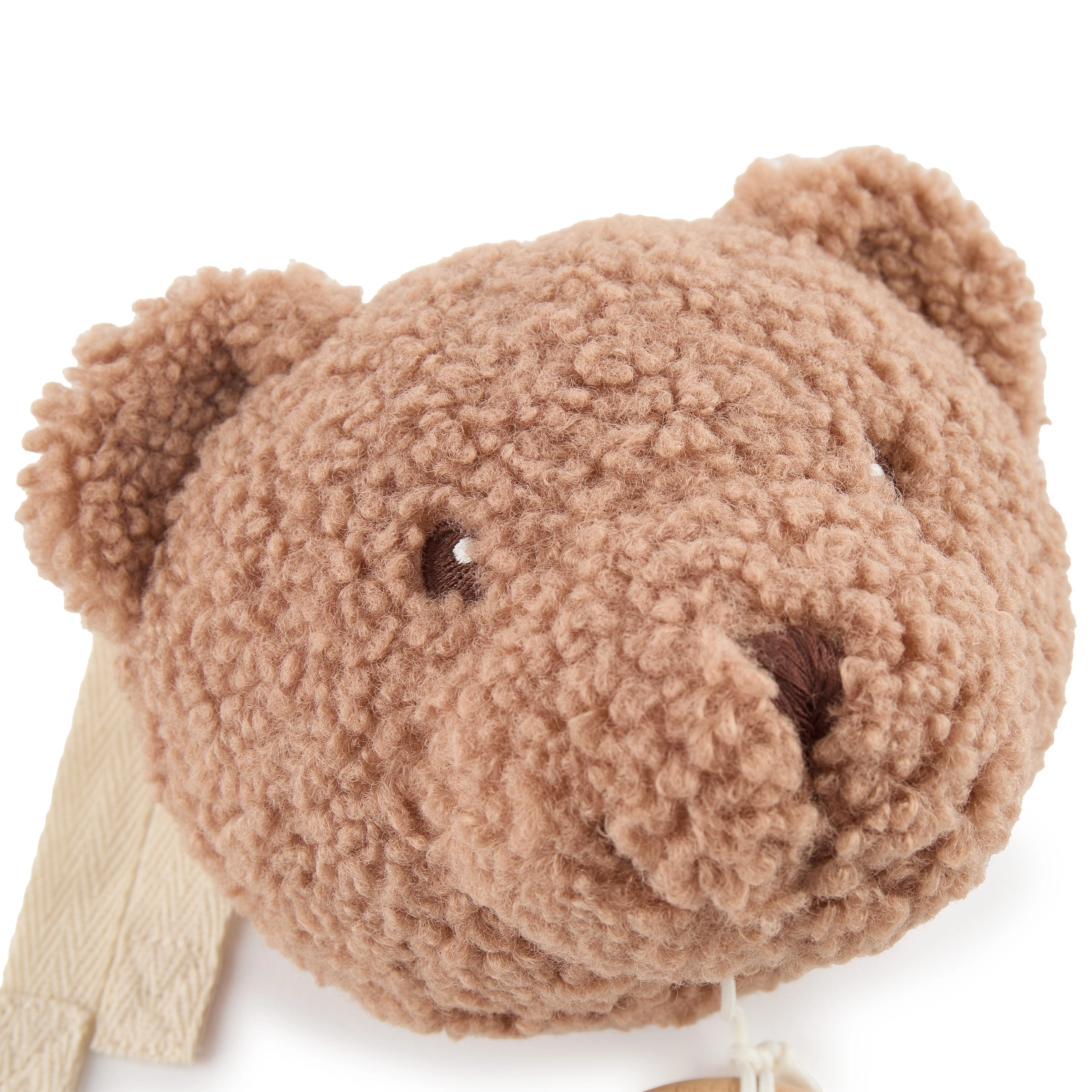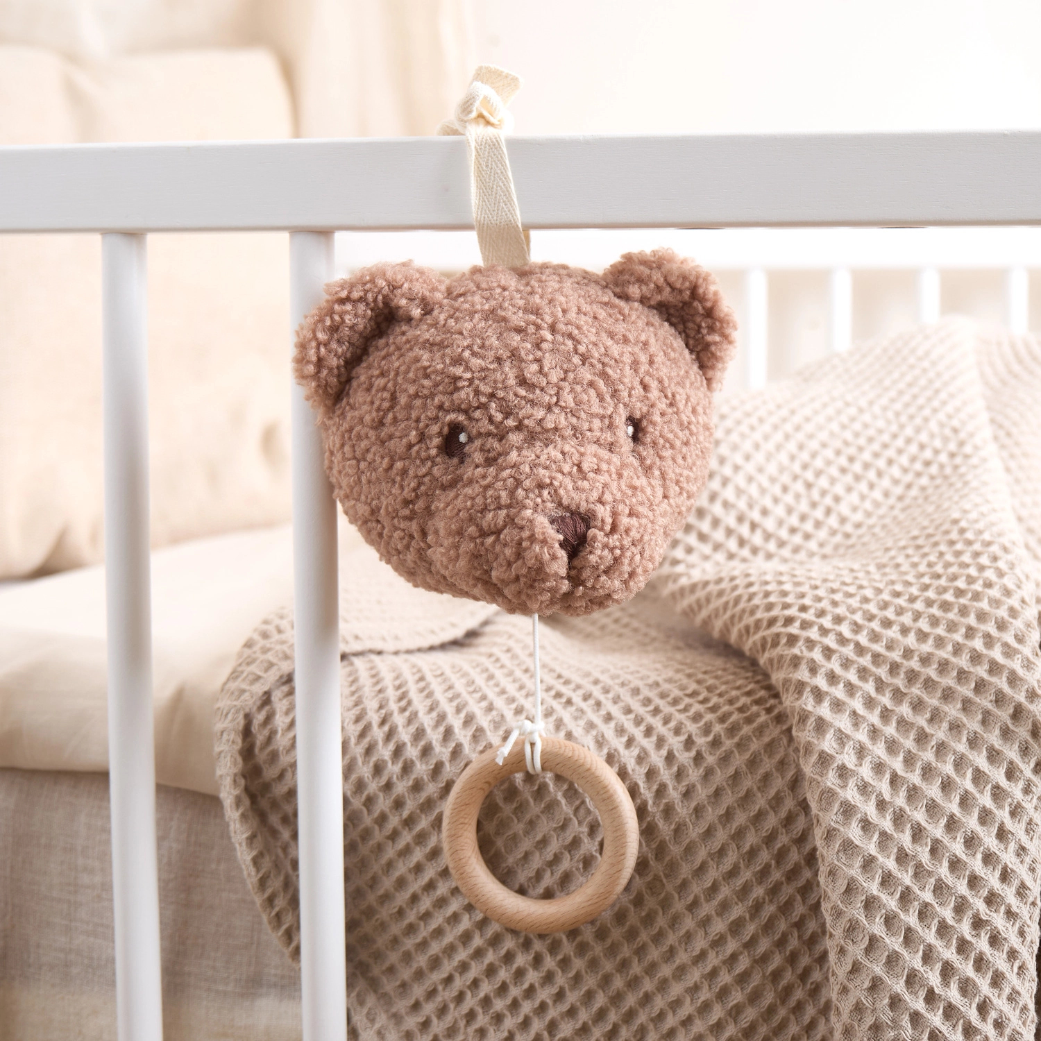 Medvedek Mika je nežna viseča igrača z glasbenim mehanizmom, ki pomaga ustvariti miren ritem večernega rituala. Dovolj je, da povlečete za gladek leseni obroček, in zazveni znana Brahmsova uspavanka »Lahko noč, lahko noč«. Zaradi mehkega, strukturiranega pliša in vezenih detajlov je igrača varna in prijetna tudi za najmlajše.