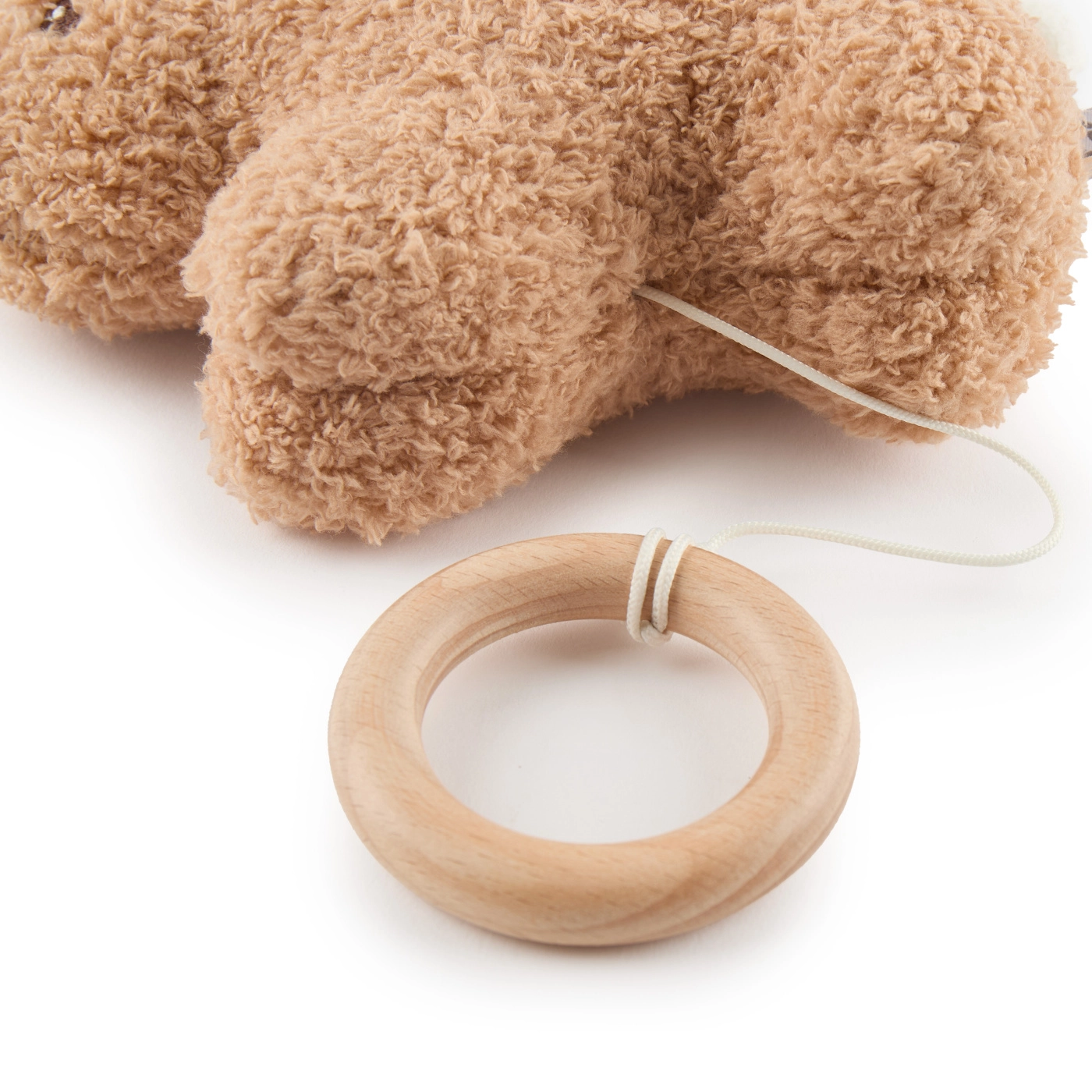Zajček je izdelan iz mehkega poliestrskega pliša, lepo se prilega otroškim ročicam in je enostaven za vzdrževanje. S tekstilno zanko igračo hitro in varno pritrdite na posteljico, voziček ali avtosedež. Leseni obroček služi za navijanje mehanizma in kot lahko oprijemljiv ročajček za majhne prstke.