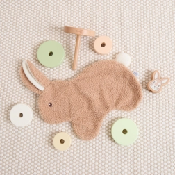 Nežna in ljubka ninica v obliki zajčka bo hitro postala najljubši spremljevalec vašega dojenčka. Mehka površina je prijetna na dotik, teksturirana tkanina in šušteči elementi pa podpirajo razvoj čutov in naravno radovednost otroka. Zahvaljujoč lahki zasnovi jo zlahka primejo tudi najmlajše ročice.