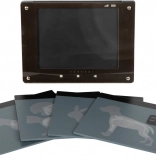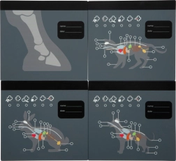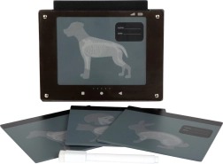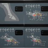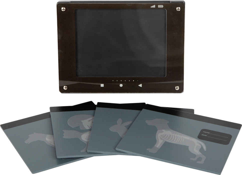 Interaktivni »rentgen« s prozornimi kartami živali (pes, mačka, zajec, konj) spodbuja domišljijo in na igriv način razlaga zgradbo telesa. Polje za zapis omogoča vnos imena pacienta in datuma pregleda.