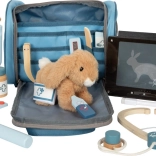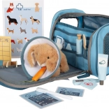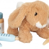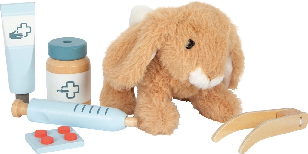 Ta prikupen veterinarski komplet združuje mehkega plišastega zajčka z realističnimi pripomočki: stetoskopom, termometrom, otoskopom, injekcijsko brizgo, povojem in zaščitnim ovratnikom. Ne manjka niti »rentgenski« tablični računalnik z izmenljivimi posnetki (pes, mačka, zajec, konj) in kartami za pisanje zapisov. Otroci vadijo skrb za živali, bogatijo besedni zaklad in krepijo zdravstveno ozaveščenost – ob tem pa uživajo v obilici domiselne zabave.