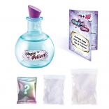 - Steklenička v obliki napoja, mešanice praškov za sluz, bleščice/konfeti, kartica napovedi, navodila