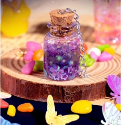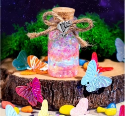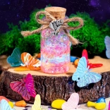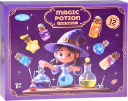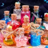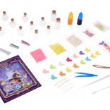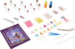 Komplet za izdelavo »čarobnih napojev« spremeni vsako idejo v bleščeče mini umetninice. Dovolj je, da v stekleničko nasujete bleščice in okraske, dodate vodo s pigmentom, zaprete s plutovinastim zamaškom in okrasite z obeski. Rezultat je lahko obesek, talisman ali ljubka dekoracija za sobico.