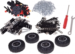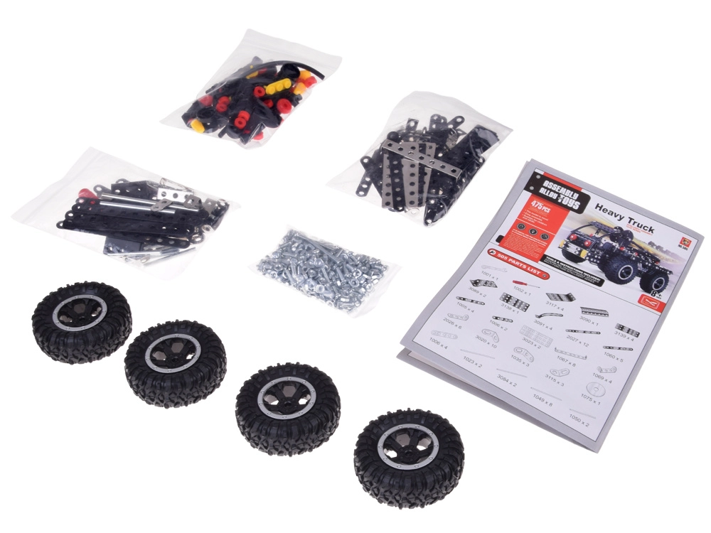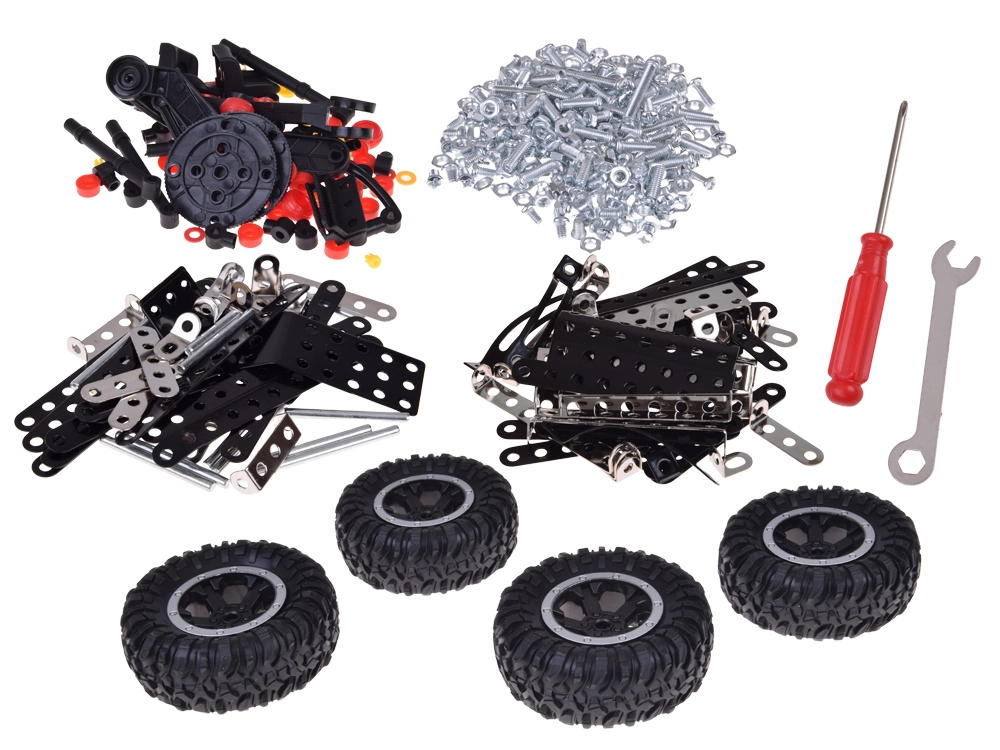 Vse potrebno v eni škatli: 475 delov, gumijaste pnevmatike, plastični dodatki, vijaki in matice, izvijač, ključ ter slikovni priročnik.