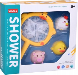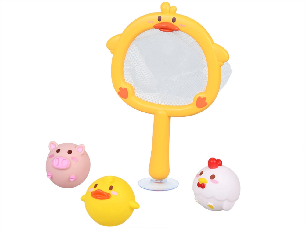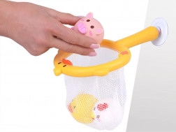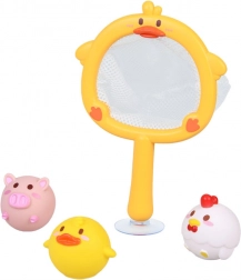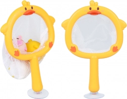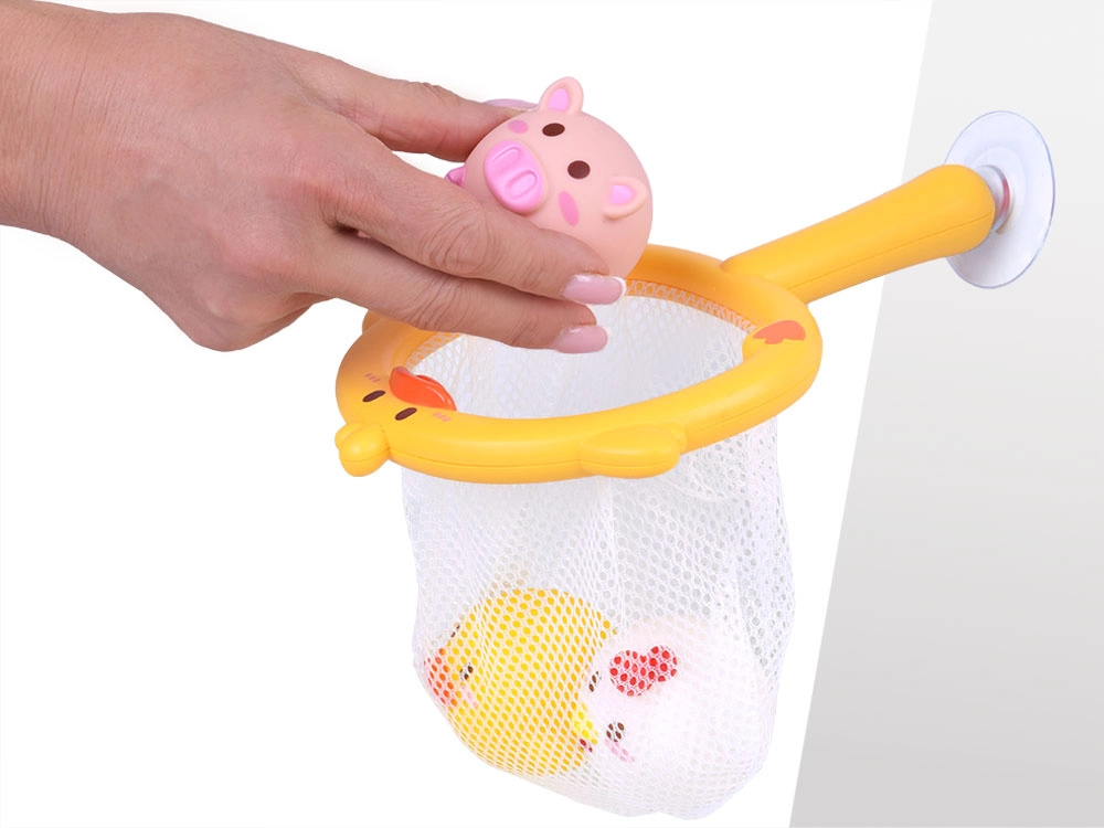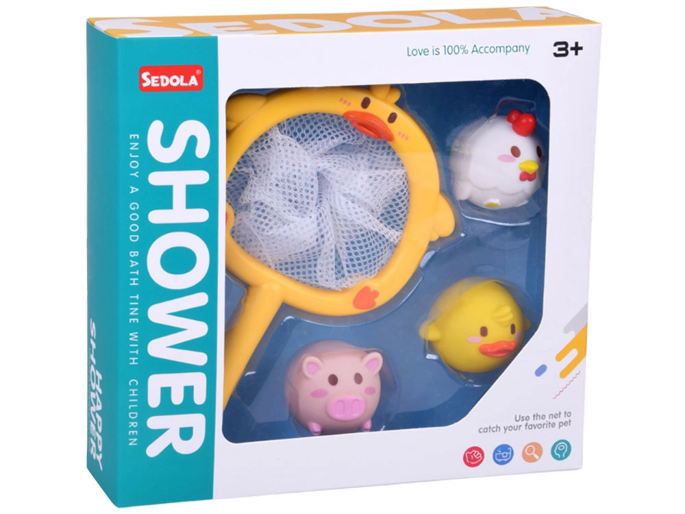 Ta ljubek kopalni set vsako kopel spremeni v zabavno igro. Otroci lahko z mrežico v obliki račke lovijo plavajoče živalice in tako trenirajo fino motoriko, koordinacijo oko–roka ter potrpežljivost. Prisesek na ročaju omogoča, da mrežico pritrdite na gladko površino kadi ali ploščic, zato igrače po kopanju zlahka osušite in ostanejo pregledno shranjene.
