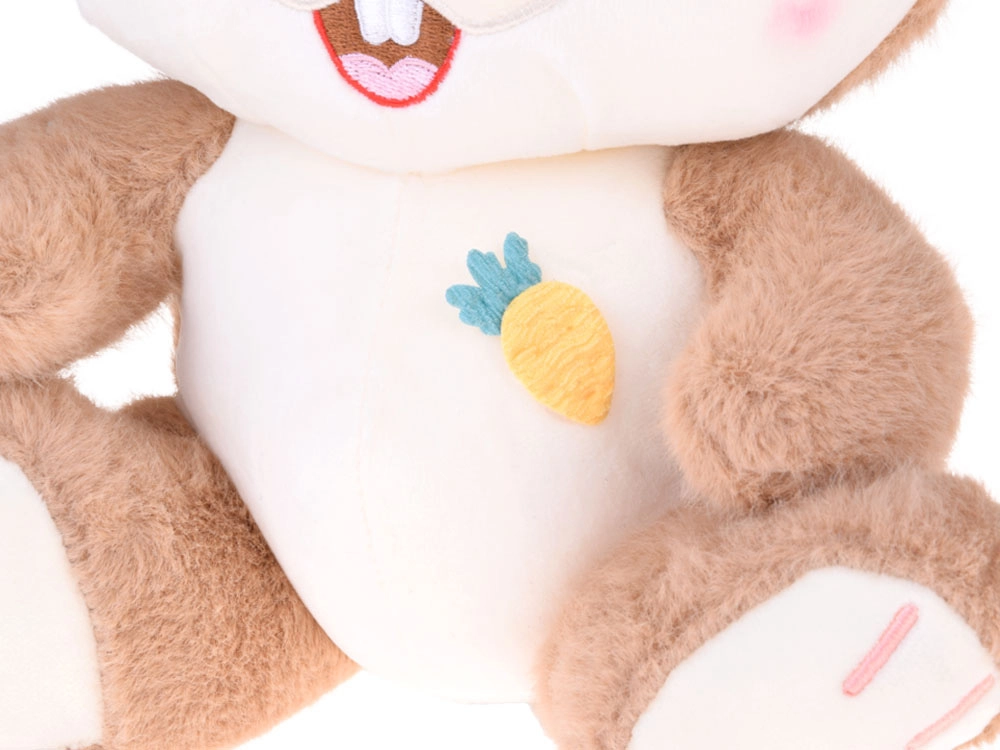 Plišasti zajček Karmelek izstopa z mehkim karamelnim kožuščkom in nežnim izrazom z ljubkimi zobki. Ušeska je zaradi všite opore enostavno nastavljati – zajček tako vsakič dobi nov izraz. Kremast trebušček z diskretnim vezenjem (korenček/ananas) doda igrači čudovit detajl.