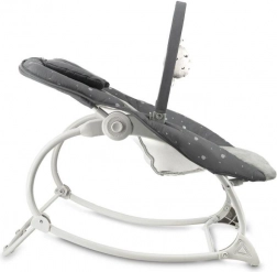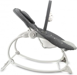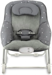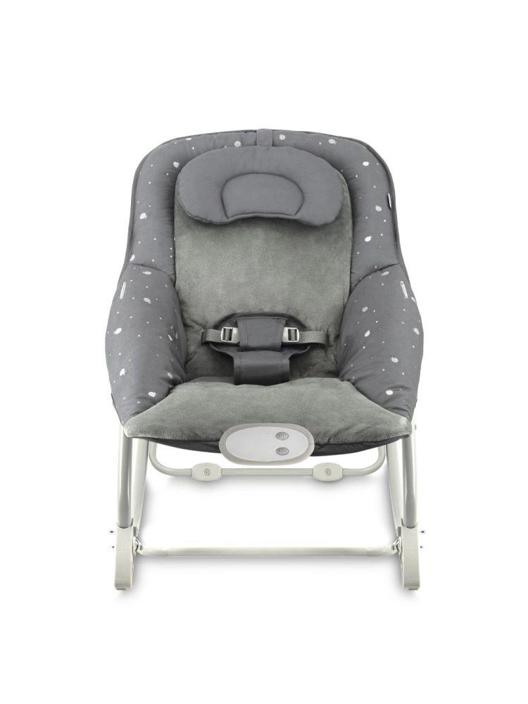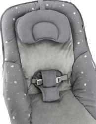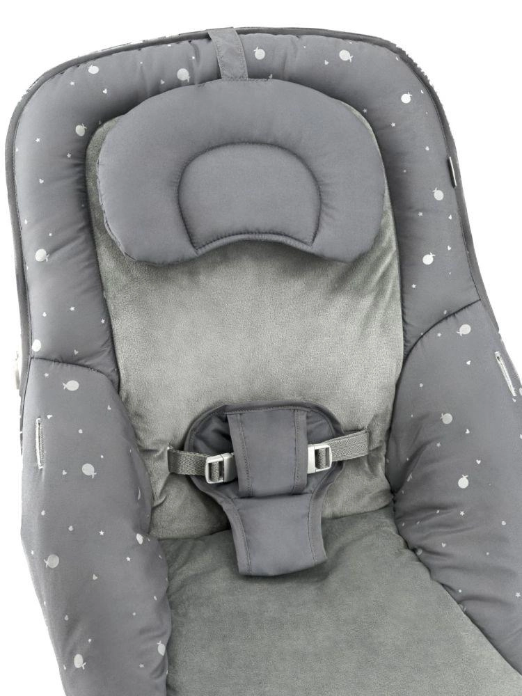 Praktična oprema vključuje snemljiv mehak vzglavnik, snemljive in pralne prevleke ter možnost blokade funkcije zibanja za stabilen položaj. Trdna in stabilna konstrukcija skupaj s 3-točkovnim varnostnim pasom izpolnjuje standarde EN 12790-2 in EN 71, zato ste lahko brez skrbi glede varne uporabe.