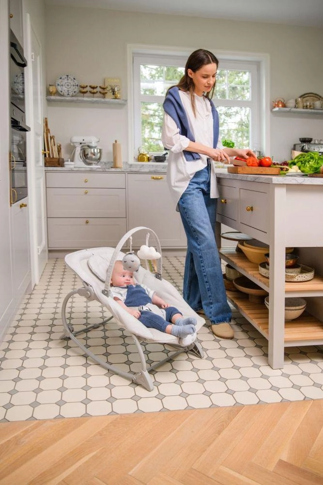 3-točkovni varnostni pas, mehak snemljiv vzglavnik in igralni lok z dvema igračama poskrbijo za varnost in senzorično stimulacijo.