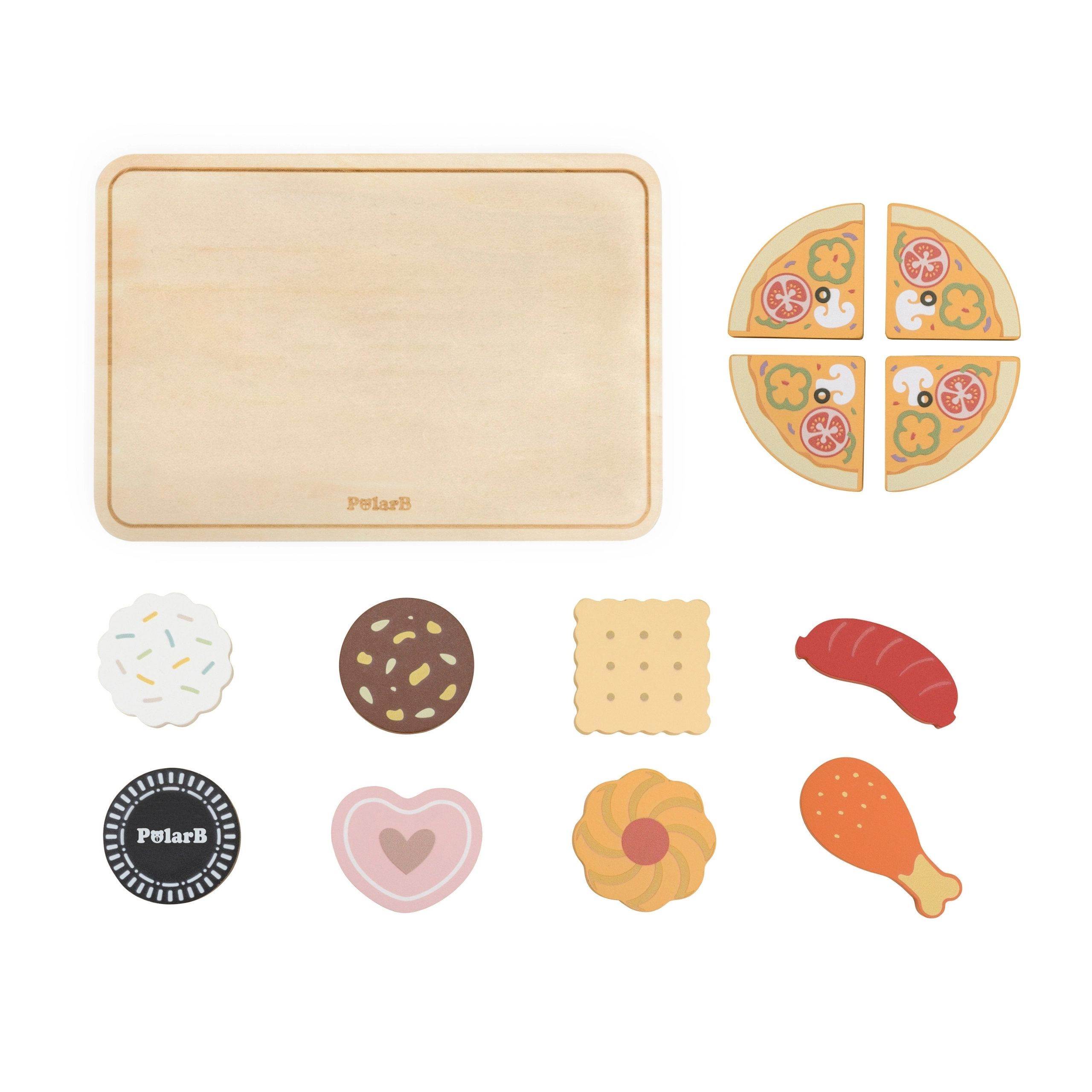 Vključeni so pekač, 6 piškotov različnih oblik, mini pica iz 4 delov, hrenovka in piščančje bedro – vse pripravljeno za postrežbo.