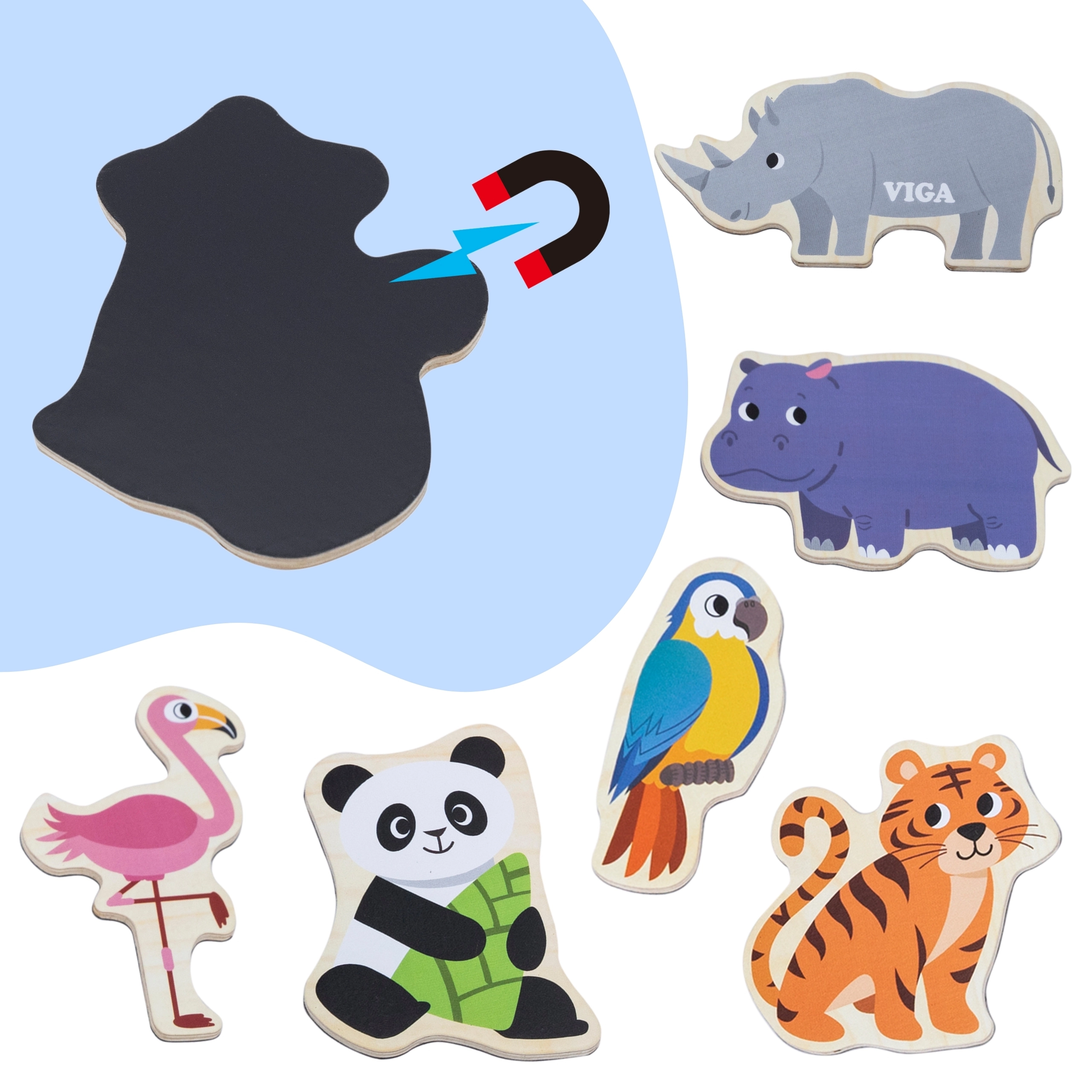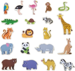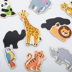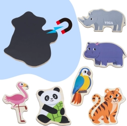 Set lesenih magnetov VIGA – Divje živali prinaša otrokom veselo in poučno zabavo. Realistično ilustrirani kosi, kot so lev, žirafa, krokodil ali papagaj, spodbujajo pogovor, spoznavanje sveta in prve zgodbe. Zahvaljujoč močni magnetni plasti se dobro držijo na hladilniku, magnetni tabli in drugih kovinskih površinah.