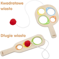 Odkrijte privlačno spretnostno igro, ki otroke motivira k gibanju in zbranosti. Dve leseni paletki – ena daljša, druga bolj kompaktna – imata več krožnih odprtin s točkovanjem (10–50). Cilj je s sunkom spraviti mehko žogico na vrvici skozi čim manjšo odprtino in tako osvojiti več točk. Odlično za samostojno igro ali prijateljske mini turnirje.