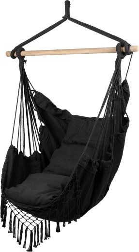 Uživajte v maksimalnem sproščanju s stilskim visečim brazilskim stolom v temno sivi barvi. Za udobje skrbijo dve blazini in mehko naslonjalo za glavo, za stabilnost pa trdna lesena prečka. Trpežna mešanica 65 % bombaža in 35 % poliestra je prijetna na dotik in hkrati dolgotrajna. Praktični stranski žepi poskrbijo, da imate vse pri roki.