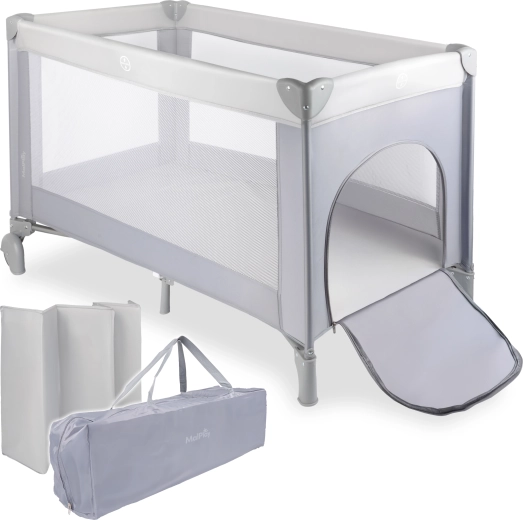 Lahka konstrukcija z dvojnimi kolesi olajša premikanje po stanovanju in med potovanjem. Tri mrežaste stranice zagotavljajo odlično kroženje zraka in enostaven nadzor nad otrokom, praktičen stranski vstop/izstop pa boste cenili pri igri. Priložena sta vzmetnica dimenzije 60 × 120 cm in praktična transportna torba.