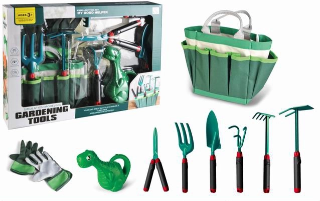 Praktičen vrtnarski komplet s prenosno torbo za enostavno organizacijo in prenašanje orodja. Idealen za domače vrtove in balkonska korita. Vsebuje vse potrebno za osnovna opravila: zalivalko, škarje, grabljice, lopatko, motiko, majhen rahljalnik in rokavice. Kompaktne mere in lahka zasnova olajšajo vsakodnevno skrb za rastline.
