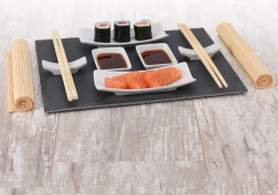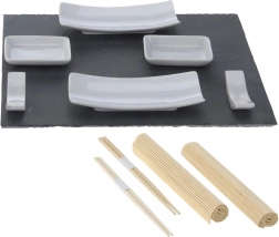 Z premišljeno sestavo elementov boste zlahka pripravili pogostitev za dva: udobne palčke s podstavki, skledice za omake, kompaktne podloge za valjanje ter kamnita deska za serviranje sushija in sashimija. Set je idealen za vsakodnevno uporabo, slavja in večere v japonskem slogu.
