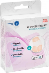 Zahvaljujoč mehki elastični gumi v pasu in hlačnih izrezih hlačke dobro ostanejo na mestu, ne tiščijo in se prilagodijo postavi. Velikost M je primerna za obseg bokov približno 90 cm. Praktično pakiranje po 2 kosa je idealno za porodnišnico in domačo uporabo.