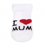 Mehke otroške frotirne nogavičke z napisi I ♥ MUM in I ♥ DAD zagotavljajo toplino, mehkobo in udobno nošenje vsak dan. Zahvaljujoč elastičnemu patentu dobro držijo na nožici, ne tiščijo in so idealne za voziček in po kopanju.