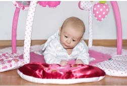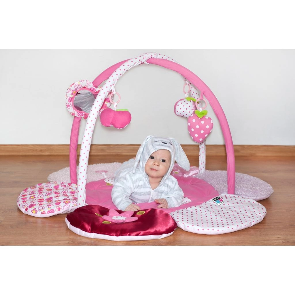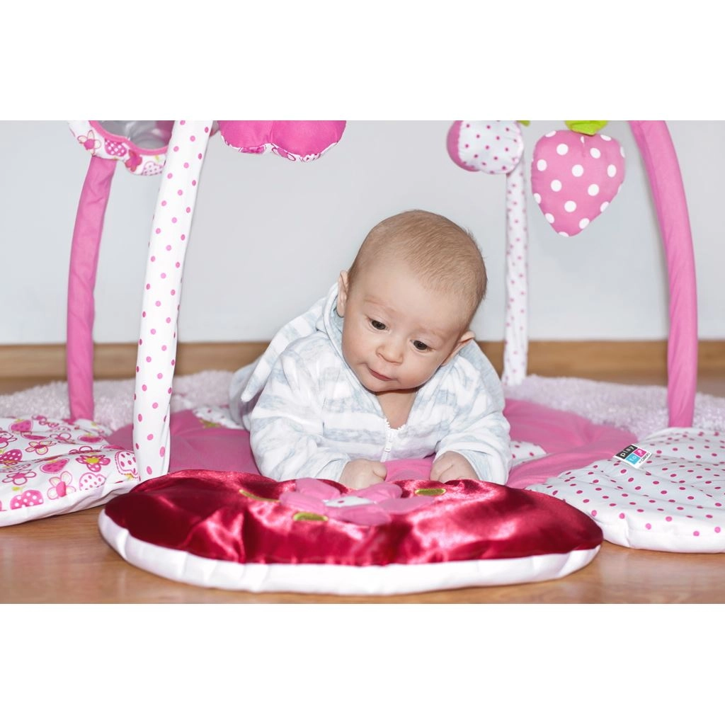 Ta stilska igralna podloga v obliki rožice ustvari za dojenčka prijeten in varen kotiček za igro in počitek. Mehko oblazinjenje zagotavlja udobje pri legi na trebuhu in na hrbtu, medtem ko odstranljiv lok s prikupnimi igračami motivira k dvigovanju glavice, raztezanju in prvim odkritjem.