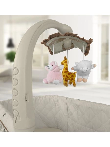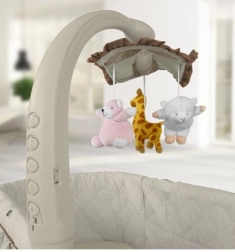 Vrtiljak s plišastimi igračkami ponuja melodije, nočno lučko z nastavitvijo intenzitete in vibracije za nežno pomiritev dojenčka. Upravljanje je preprosto z daljinskim upravljalnikom.