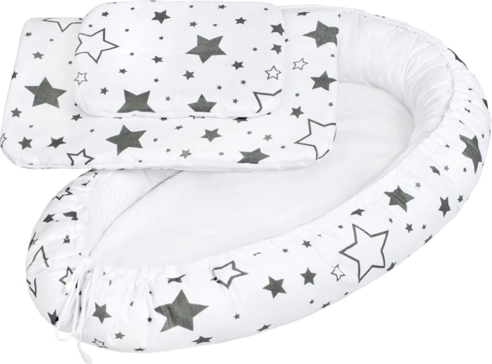 Praktično in udobno gnezdece za novorojenčka s perinicama znamke New Baby v elegantni sivi barvi z zvezdicami. Dojenčku nudi občutek varnosti, izdelano je iz varnih in kakovostnih materialov, primerno od 0–3 mesecev in je idealno za posteljico, kavč ter na potovanja.