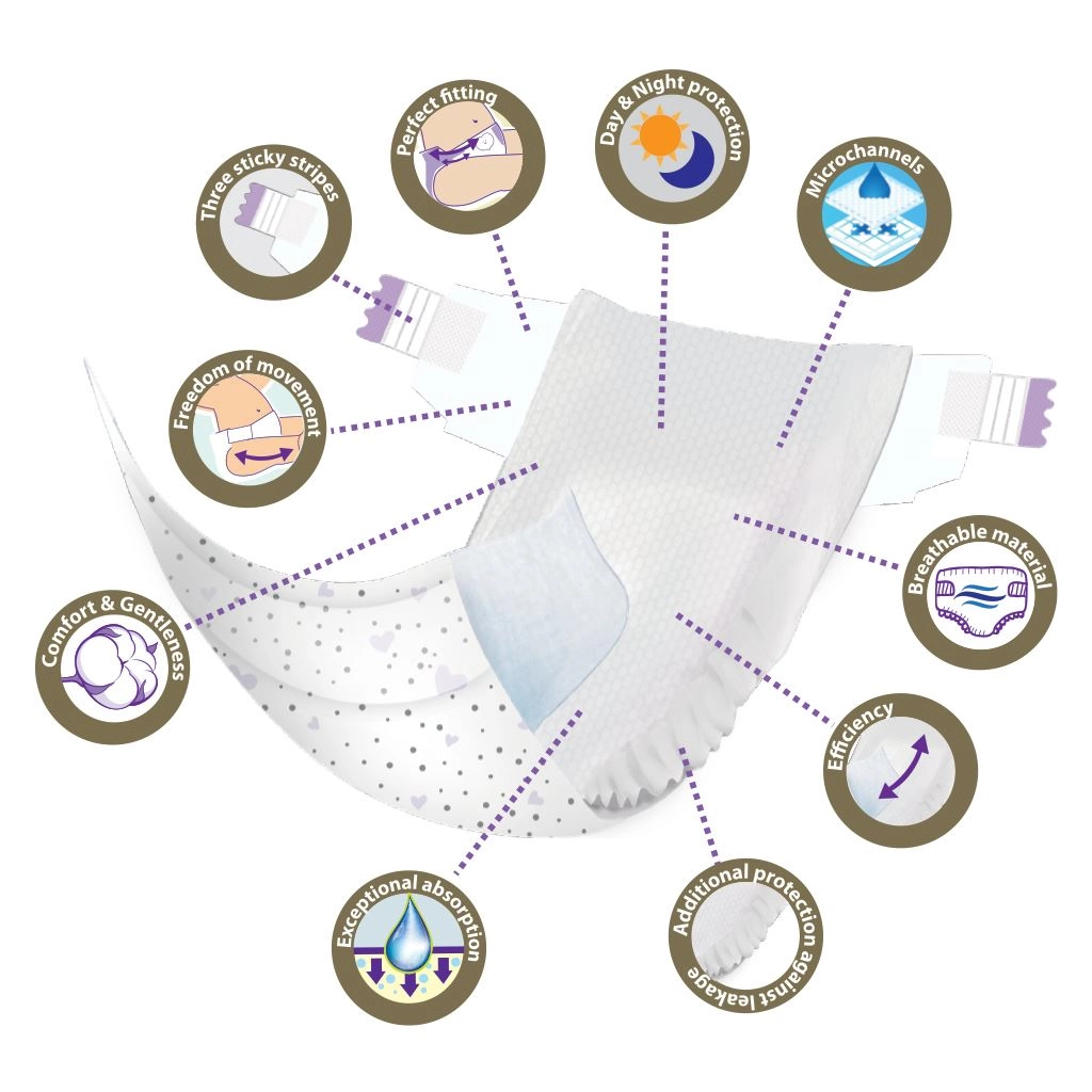 Plenice New Love Premium Comfort so zasnovane za udobje in zaščito otroške kože. Zračni materiali podpirajo kroženje zraka, medtem ko inovativno jedro z mikrokroglicami takoj zaklene vlago in ohranja ritko suho. Zahvaljujoč širokemu, mehkemu sprednjemu pasu in 3D ježku se plenica popolno prilagodi obliki trebuščka.