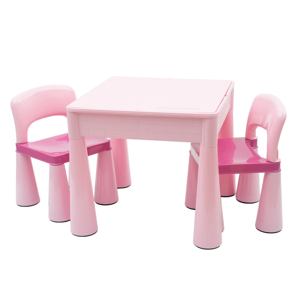 Praktična otroška garnitura NEW BABY vsebuje mizico in 2 stolčka v nežni roza barvi. Večnamenska plošča se z obračanjem spremeni v podlago za sestavljanke LEGO in LEGO DUPLO, pod njo pa je prostoren shranjevalni zaboj za igrače ali barvice. Mizo je mogoče uporabiti tudi kot mini peskovnik ali za vodne igrarije. Enostavno čiščenje, zaobljeni robovi in stolčki z nosilnostjo 25 kg.