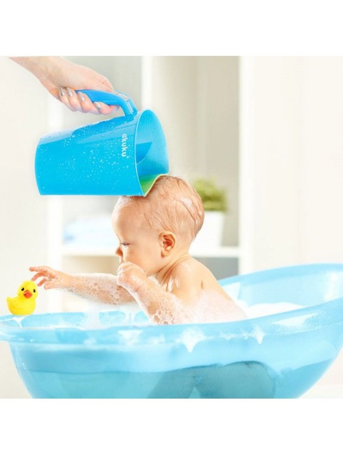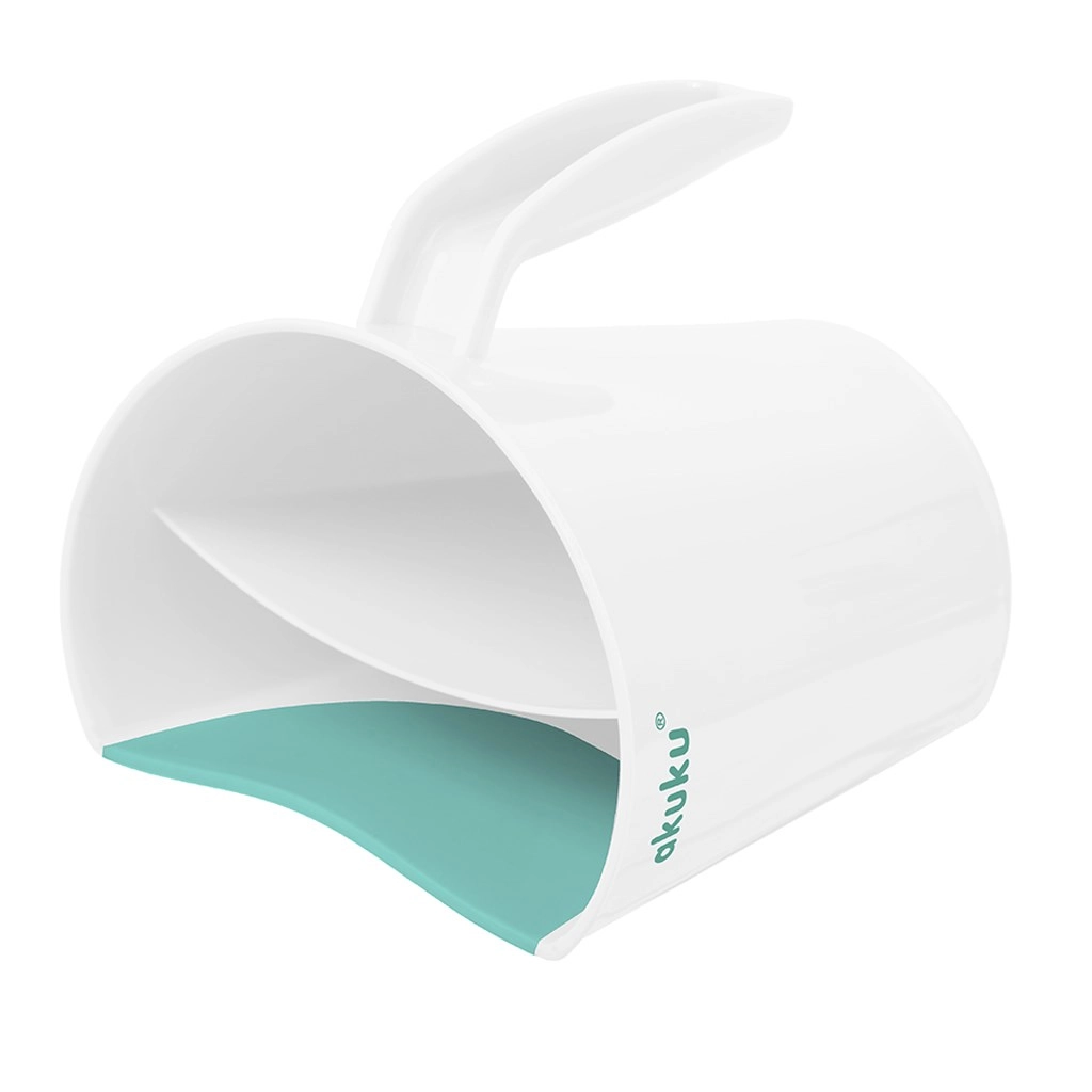 Posodica AKUKU v belo‑mint izvedbi je pameten pomočnik za vsakodnevno kopanje dojenčkov in večjih otrok. Mehak, prilagodljiv rob se nežno pritisne na čelo in usmerja vodni tok tako, da ne pride v oči. Dve ločeni komori omogočata nadzorovano nalivanje in enakomerno izpiranje šampona ter pene.