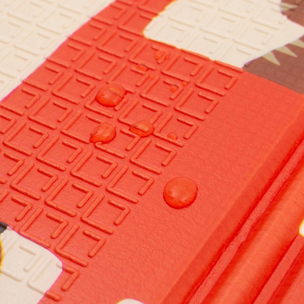 Material XPE in laminirana folija zagotavljata odpornost proti vlagi, preprosto vzdrževanje in prijeten otip. Podloga odlično izolira od hladnih tal, ščiti pred pršicami iz preprog in duši hrup. Certificirana je po EN71, ne vsebuje ftalatov in izpolnjuje stroge zahteve glede varnosti in kemične sestave.