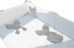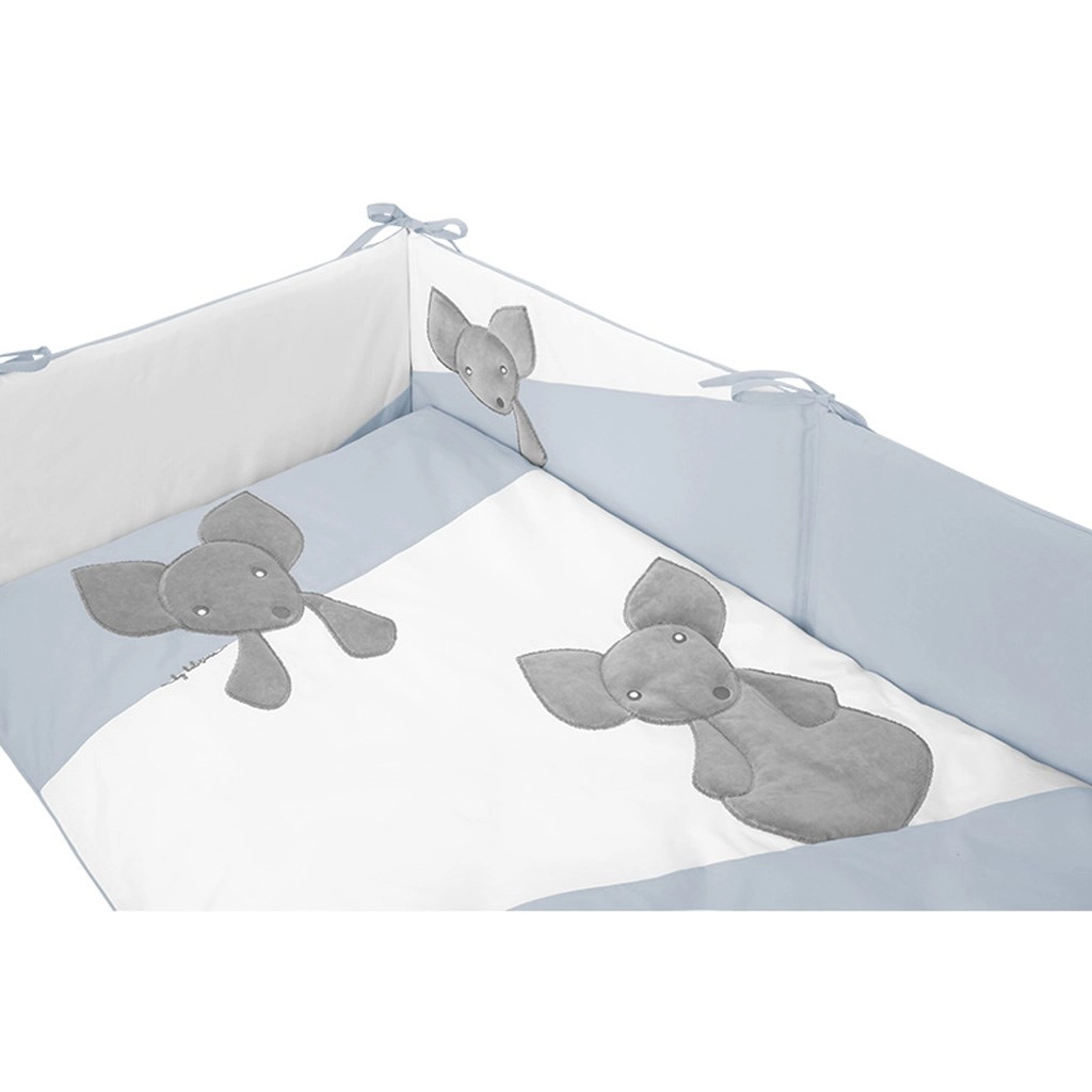 Pomirjujoči modri toni in ljubek motiv miške se podajo v večino otroških sobic. Obroba z mehkim oblazinjenjem povečuje varnost v posteljici in zaradi vezalk trdno stoji. Varnostne zadrge brez vlečkov ter odsotnost gumbov in kovinskih delov zmanjšujejo tveganje za sproščanje majhnih komponent.