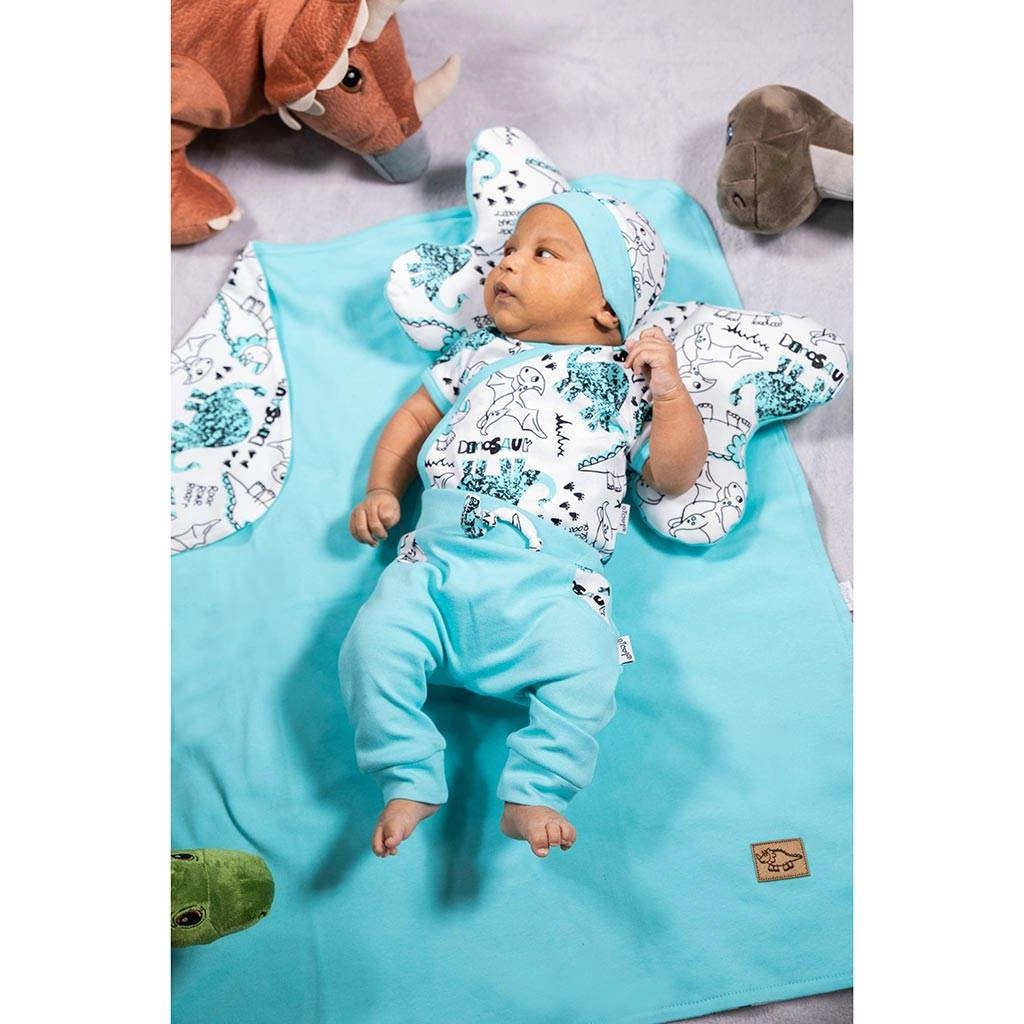 Čisti bombaž je mehak, zračen in primeren za občutljivo otroško kožo. Potisk z dinozavri doda oblačilu igriv videz, primeren za doma, za sprehod ali voziček.