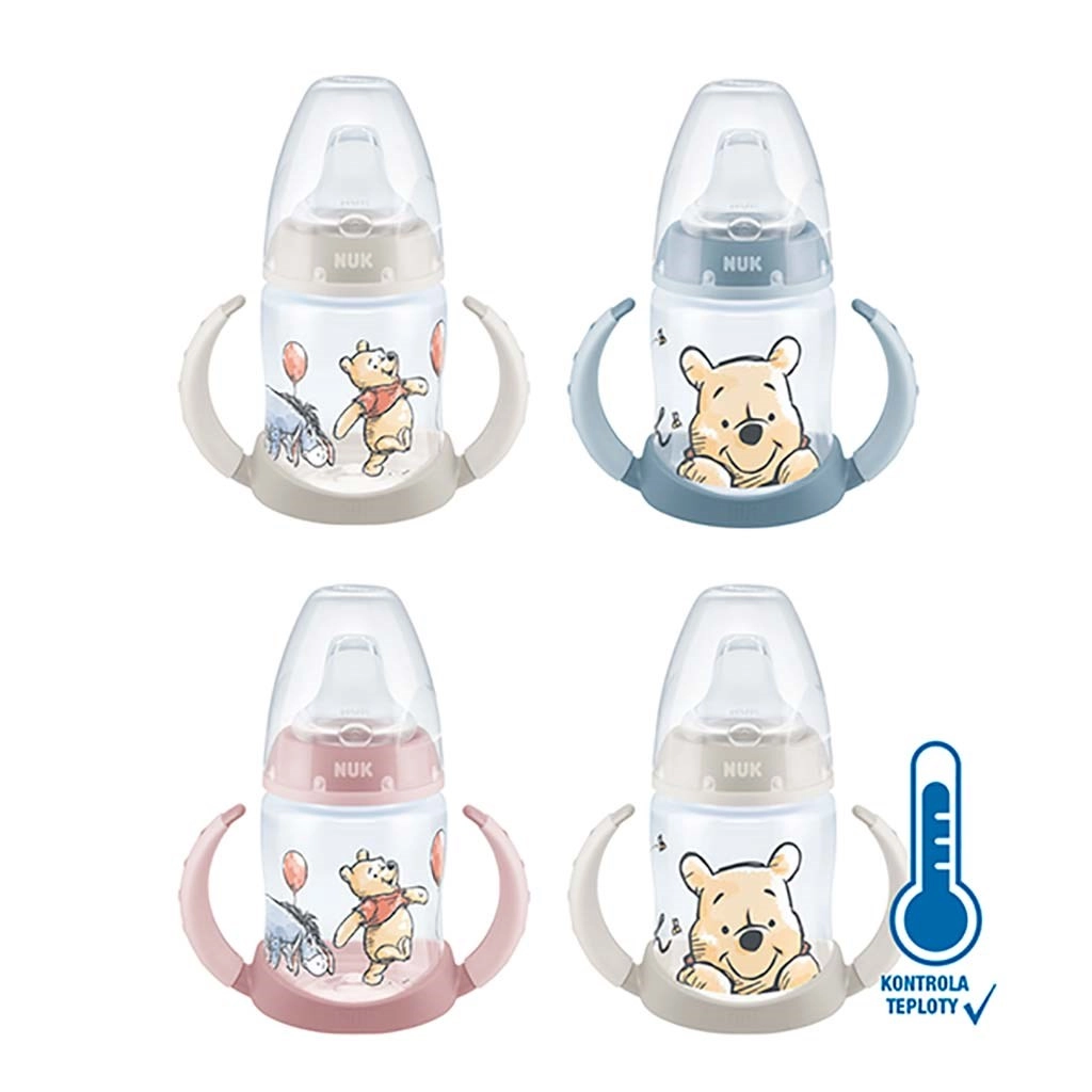 Učilna steklenička NUK First Choice z motivom MEDVEDEK PU je zasnovana za udoben in varen trening pitja otrok od 6 do 18 mesecev. Indikator temperature na steklenički takoj pokaže, ali je pijača primerna za postrežbo – ko je vsebina prevroča, se modra barva spremeni v belo. Mehki silikonski nekapajoči ustnik preprečuje polivanje in podpira gladek prehod od dojenja ali hranjenja na samostojno pitje.